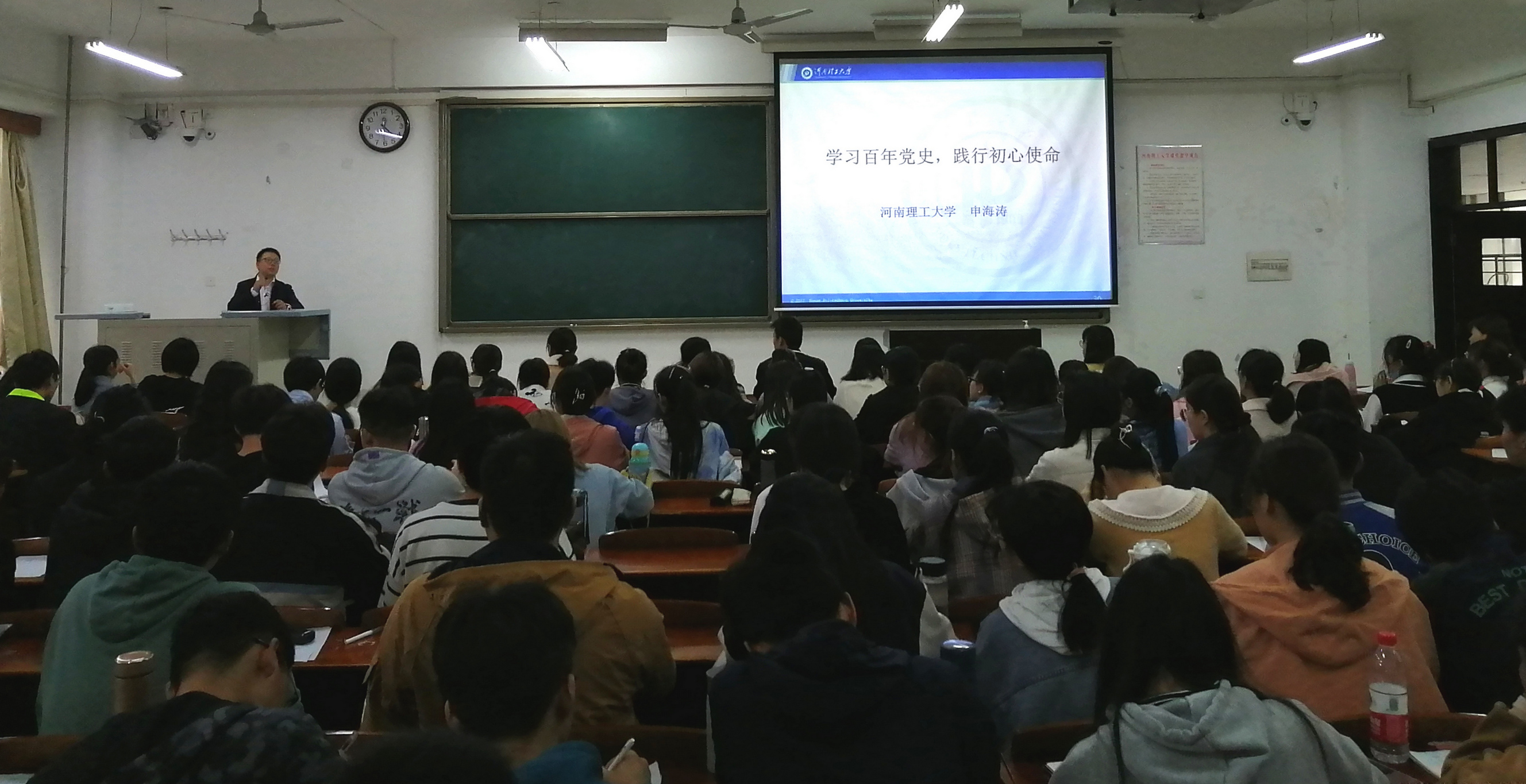 课上,申海涛主要讨论了两个部分内容。在谈到中国共产党的伟大奋斗征程部分中,他讲述了国家在风雨飘摇中的探索。中国共产党成立以来,带领中国人民浴血奋战,实现了抗日战争和解放战争的胜利,新中国建立以后,中国共产党领导人民一心一意搞建设,完成了百废待兴的中国快速重建和发展。在不忘初心、牢记使命的信仰讲述中,他认为,青年人要坚定理想信念,将祖国放在心中。必须以时不我待、只争朝夕的斗争精神,以永不懈怠的精神状态和一往无前的奋斗姿态,持续努力、勇往直前,在社会的需要中持续发光发热!