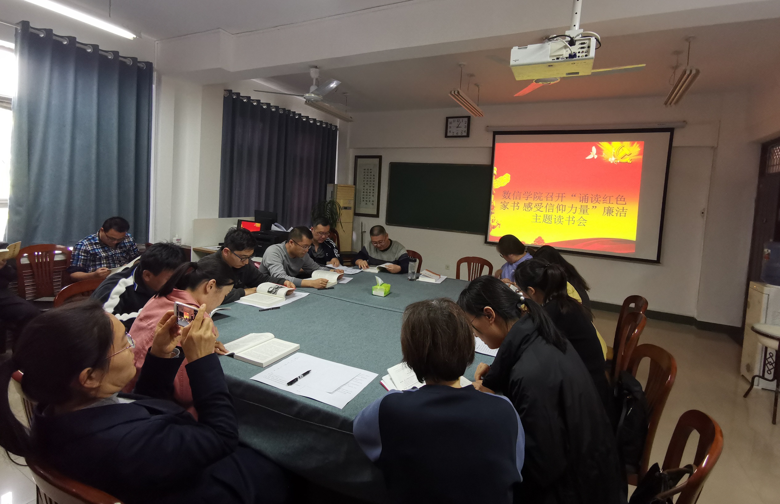 为认真学习贯彻十九届中央纪委五次全会、十届省纪委六次全会精神,推动全面从严治党、党风廉政建设和反腐败斗争向纵深发展,根据学校文件精神,4月27日下午,数信学院在404召开“诵读红色家书 感受信仰力量”廉洁主题读书会。