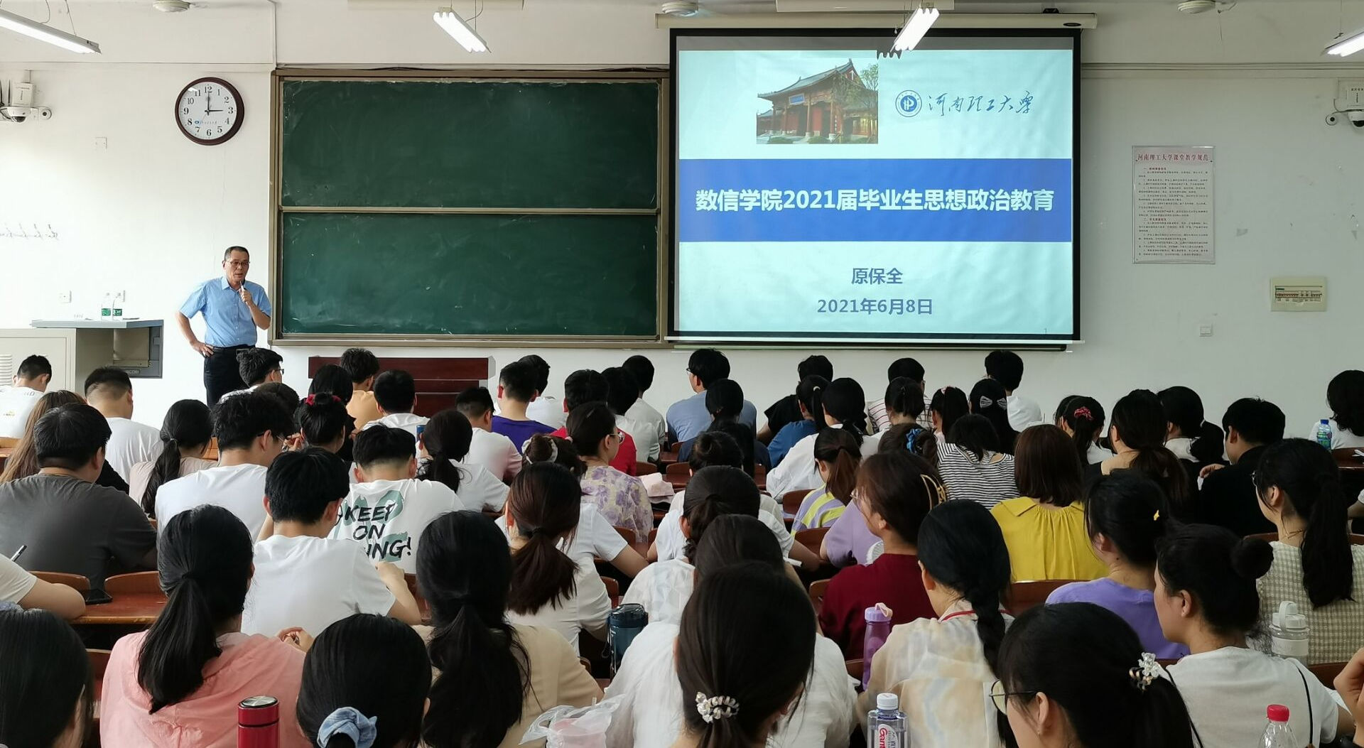 为进一步提升毕业生的理论修养和政治素养,坚定信心迎接未来的挑战,6月8日下午,数信学院在三号教学楼3206教室进行思想政治教育讲座。院长原保全担任主讲人,为2021届本科毕业生上思政课。