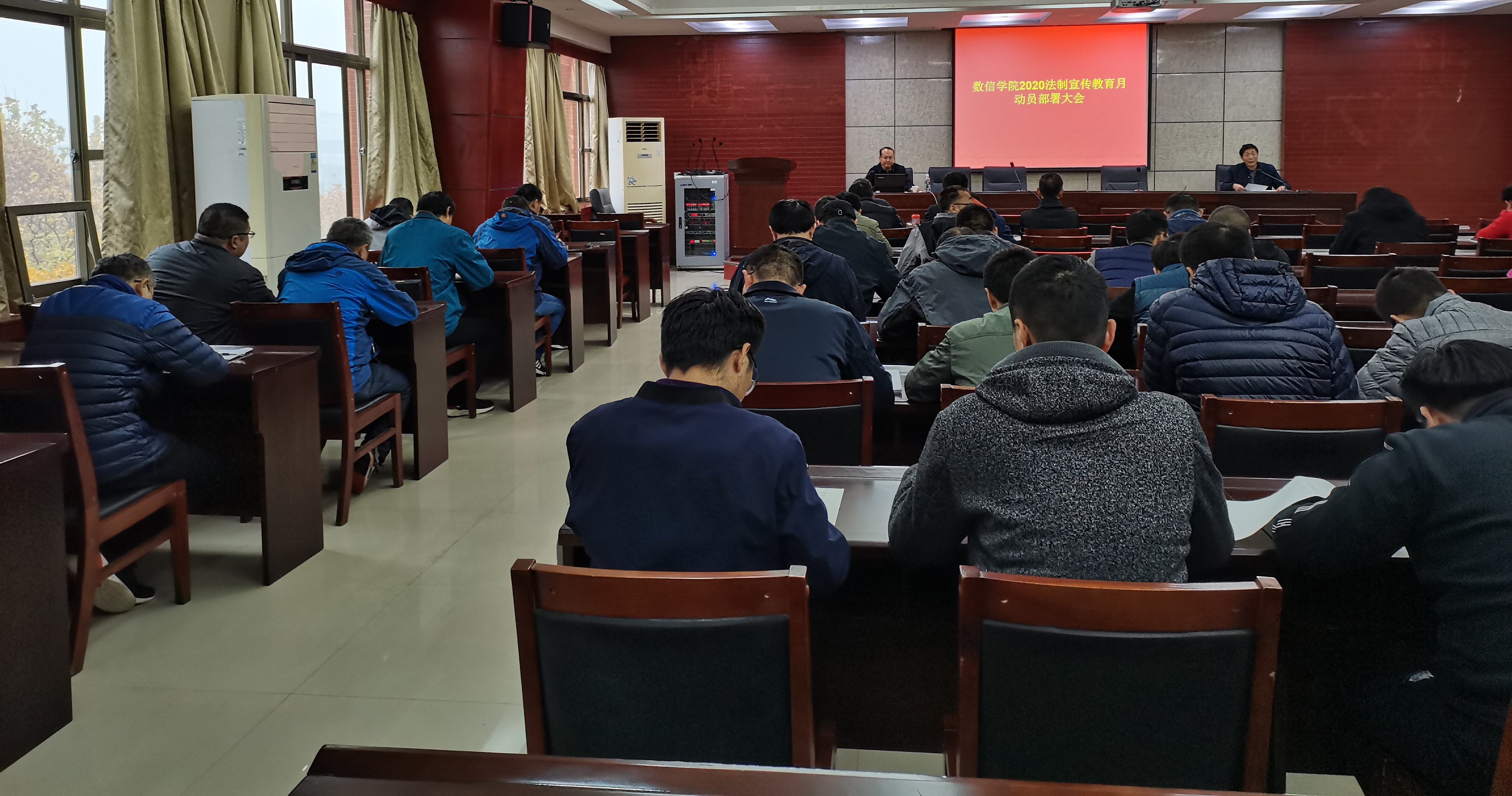 成军祥书记传达了学校《关于开展法治宣传教育月活动的通知》文件精神,并对学院2020年法治宣传教育月的活动进行了安排和部署。他强调,大家要深刻理解开展法治宣传教育活动的重要意义,将其作为加强党纪教育、学习法律知识、培育法治信仰的重要载体,认真学习贯彻习近平总书记全面依法治国新理念新思想新战略,并要求全院师生通过多种形式推进学院的法治宣传工作,将遵法、守法、学法、用法深入生活,推动校园法治建设。