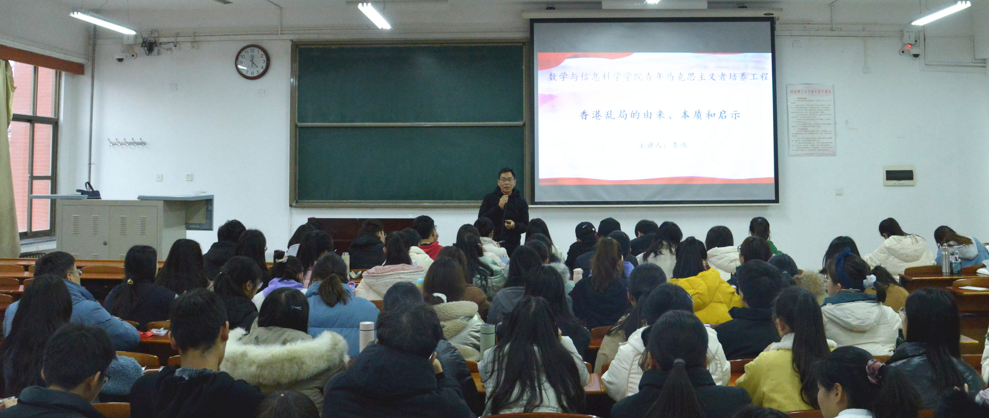为培养和提升学生的政治意识,激发他们的爱国热情,12月8日下午,数信学院在第三教学楼3201教室举办专题讲座。讲座邀请校宣讲团专家、马克思主义学院李伟老师为大家作报告,报告题为“香港乱局由来、本质和启示”。院团委书记王孝华和院青马班学员、团校团干聆听本次讲座。