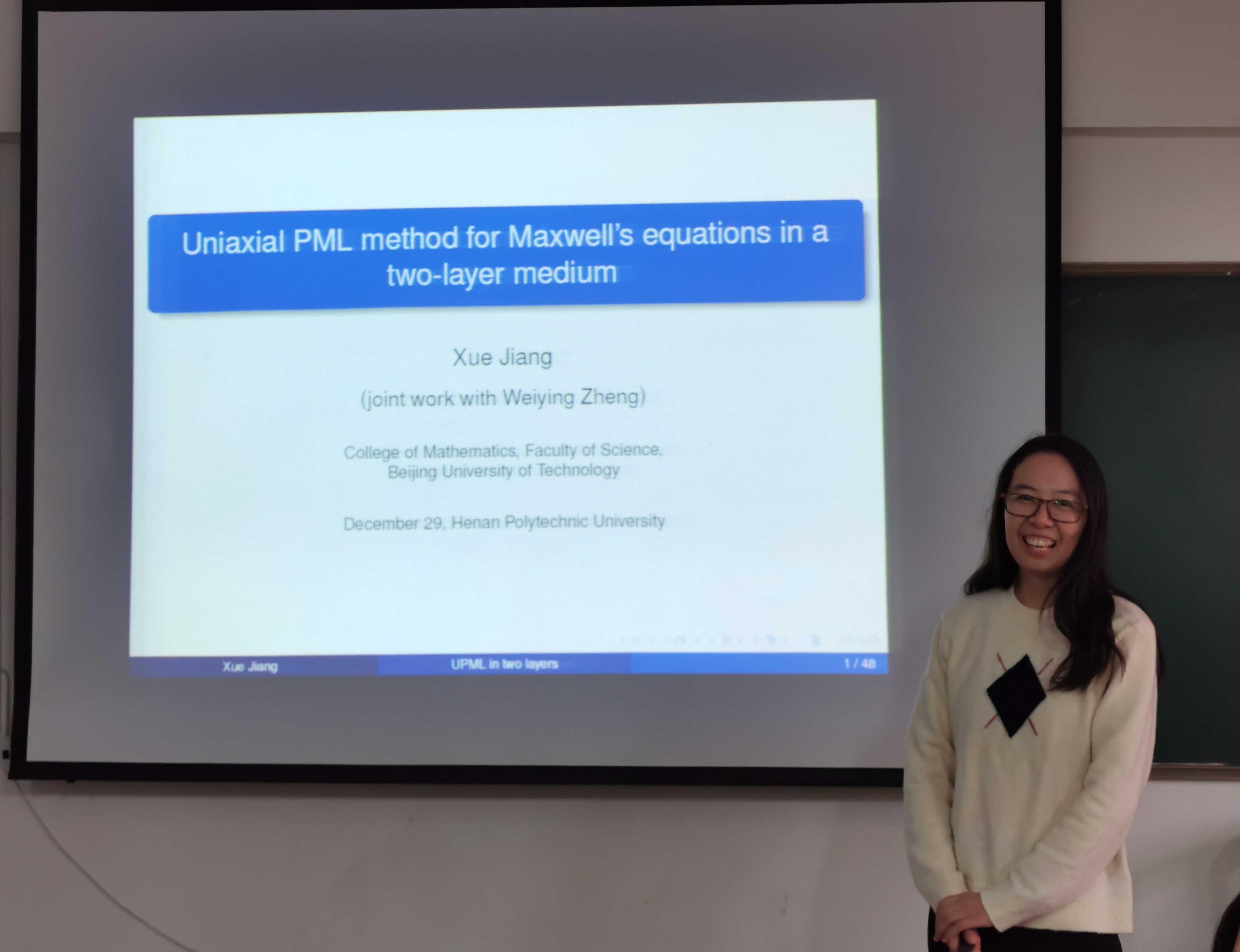 2020年12月29日上午,北京工业大学江雪教授受邀为我院师生做了题为“UPML method for electromagnetic scattering problems in a two-layer medium”的学术报告。该报告在数信学院402举办,会议由牛海峰主持,学院相关领域的老师和研究生参加了会议。江教授主要讲了求解无界区域的电磁场完美匹配层(PML)方法,给出了国内外研究进展,分析的算法的逼近性质和分析技巧。报告内容丰富,深入浅出,推进和促进计算数学研究发展。本次报告加强了我校老师和国内计算数学学者们之间学术交流与合作,对今后我校师生们在相关领域的研究具有很好地启发和指导。