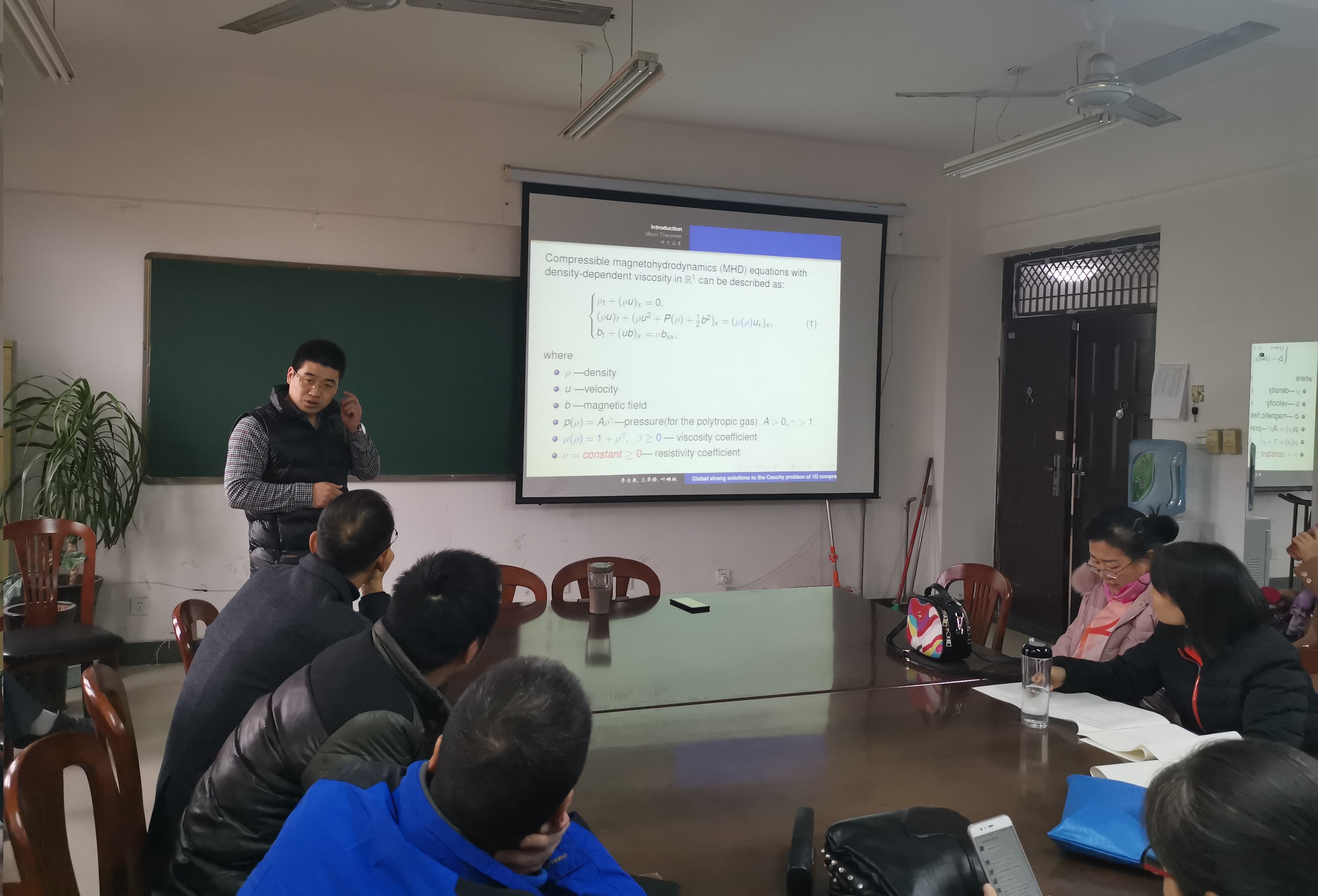 李自来博士报告的题目是《电阻系数为零的可压缩MHD方程组强解的整体存在性》。李自来博士首先从可压缩MHD方程组物理背景,当前研究现状和存在的问题讲起,由此引出要考虑的问题——粘性系数依赖于密度或者粘性系数为常数的电阻系数为零的可压缩MHD方程组:当初始密度含有真空,一维可压缩MHD方程组Cauchy问题强解的整体存在性及唯一性。接着,从微积分观点分析了这一问题存在的主要困难以及克服这些困难的方法。最后,李自来博士介绍了博士后期间艰难的研究历程,研究成果以及将来要考虑的问题