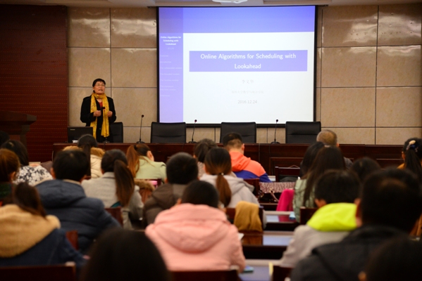 报告会上,李文华首先肯定了数信学院运筹学工作的开展,接着通过生活实例生动引入在线排序等相关运筹学内容,并对其发展和今后的研究方向进行了深入细致的讲解。报告中,她介绍了在线排序四大模型、竞争比等排序论知识,并带领现场师生回顾国内外在线排序问题发展历史、及报告她的研究成果。李文杰对具有友好释放时间的不同在线排序进行对比分析及其研究成果在医疗、工业等领域的应用,并指出今后的发展方向。数信学院青年博士参与会议发言,并介绍了自己的学术成果及观点。