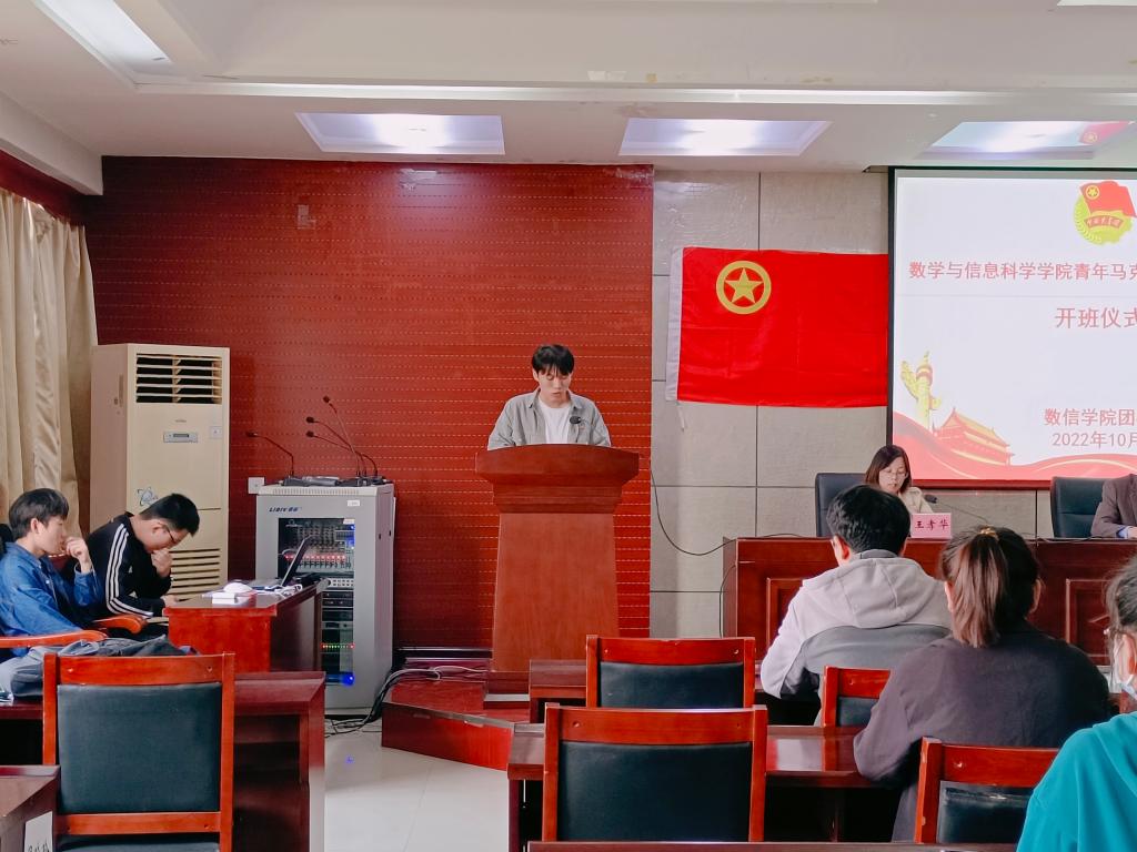 开班仪式在雄壮的国歌声中拉开帷幕。开班仪式上,2021级辅导员赵楠宣读《数学与信息科学学院“青年马克思主义者培养工程”实施方案》。随后,王明中为本次“青马工程”培养班授旗。接着,全体学员进行宣誓。学校第十二期青马工程培养班学员代表数实验1902班胡梦迪和本期学员代表数实验2101班贺仕如上台发言,用生动有力的语言表达自己对于青年马克思主义者培养班的祝福和期待。最后,学院党委副书记王明中对全体学员提出三点要求,一是提高思想认识,真正做到用马克思主义理论武装头脑;二是珍惜培训机会,自觉强化个人成长成才意识;三是坚定理想信念,做堪当民族复兴大任的新时代青年。