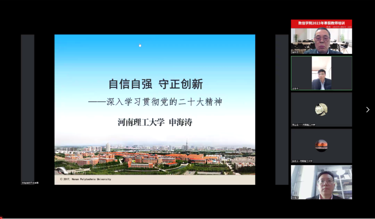 为深入学习贯彻党的二十大精神,推动习近平新时代中国特色社会主义思想和党的二十大精神入脑入心,引导党员干部师生深刻认识党的二十大的重大意义,深入领会党的二十大提出的重要思想、重大论断、重点部署,1月9日下午,数信学院邀请校宣讲团专家申海涛通过腾讯会议为全院教工作题为“自信自强 守正创新—深入学习贯彻党的二十大精神”专题讲座,会议由原保全院长主持。