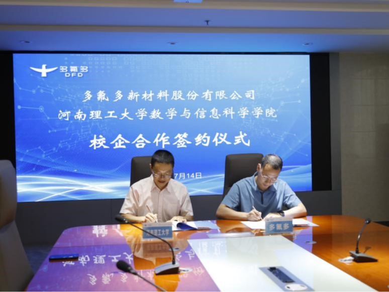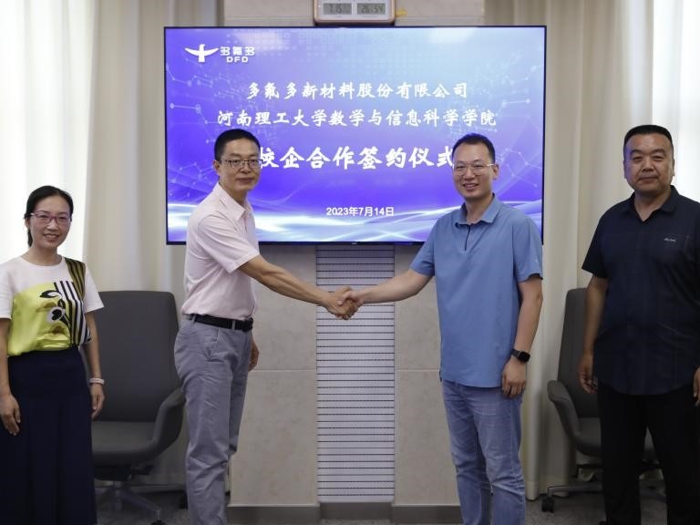 本网讯(通讯员 刘新乐)7月14日,数学与信息科学学院与多氟多新材料股份有限公司校(院)企合作协议签字仪式在多氟多科技大厦举行。学院副院长牛海峰与多氟多公司运营副总经理王岩代表双方共同在校(院)企合作框架协议上签字,多氟多大学院长张仲延出席,学院有关团队负责人参加活动。