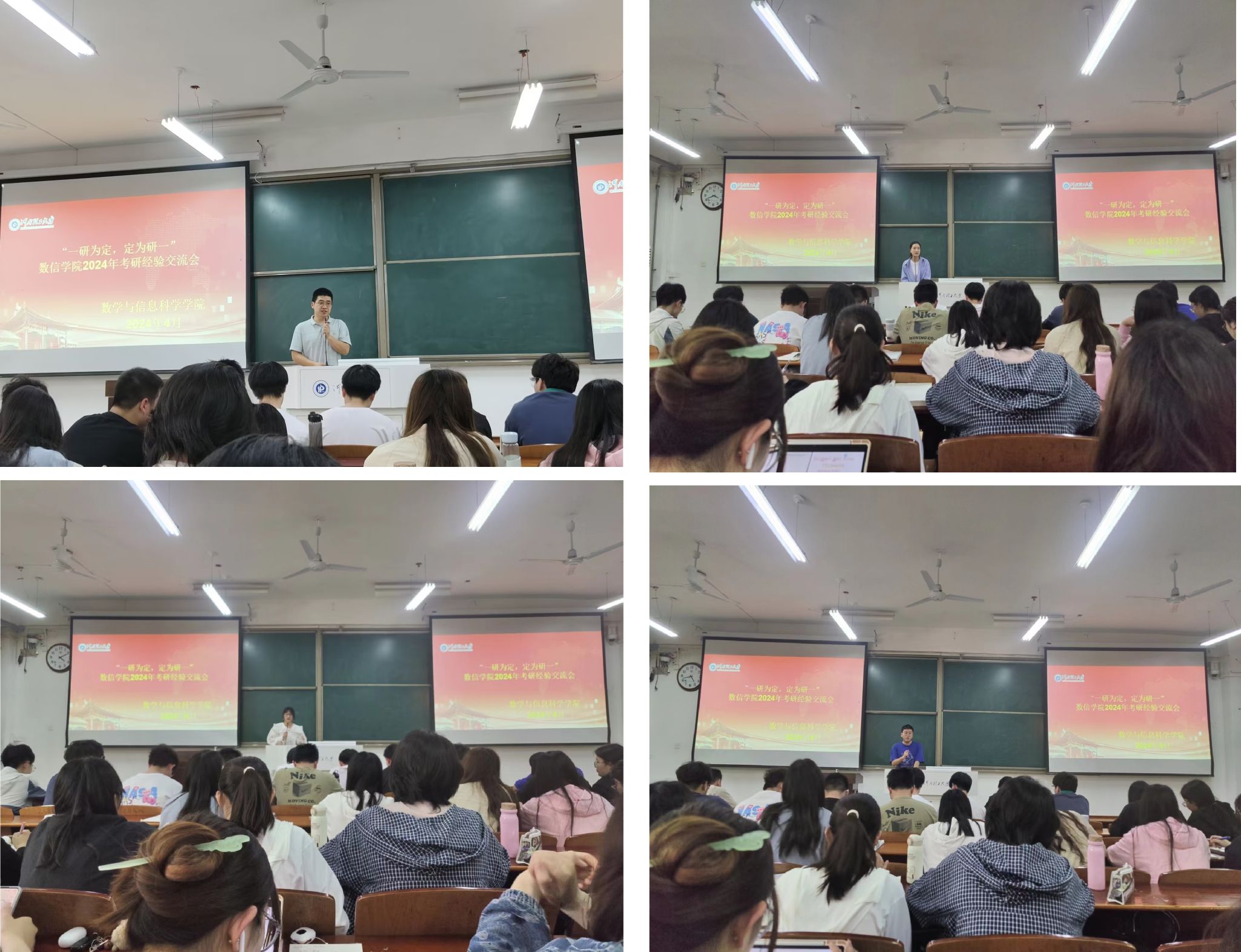 本网讯(通讯员 赵楠 仝若瑾)2024年4月16日,数信学院数学与应用数学系教工党支部与班长联席会在三教3104会议室联合举办以“一研为定,定为研一”为主题的考研经验交流会。教工党支部书记李自来、教研室副主任刘杰、辅导员赵楠、2021届优秀毕业生申华通及管锋彬等四位2024届优秀学生代表出席会议,学院21级共160余名学生参加会议,会议由数实验2102班班长廉子元主持。