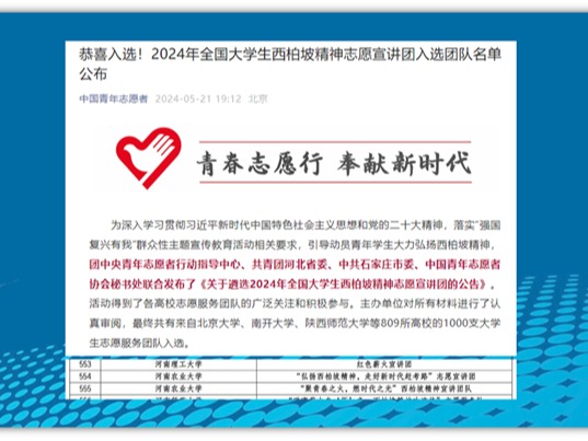 本网讯(通讯员 王春月)为深入学习贯彻习近平新时代中国特色社会主义思想和党的二十大精神,落实“强国复兴有我”群众性主题宣传教育活动相关要求,引导动员青年学生大力弘扬西柏坡精神,5月21日,团中央青年志愿者行动指导中心、共青团河北省委、中共石家庄市委、中国青年志愿者协会秘书处联合发布了《关于遴选2024年全国大学生西柏坡精神志愿宣讲团的公告》。活动得到了各高校志愿服务团队的广泛关注和积极参与。