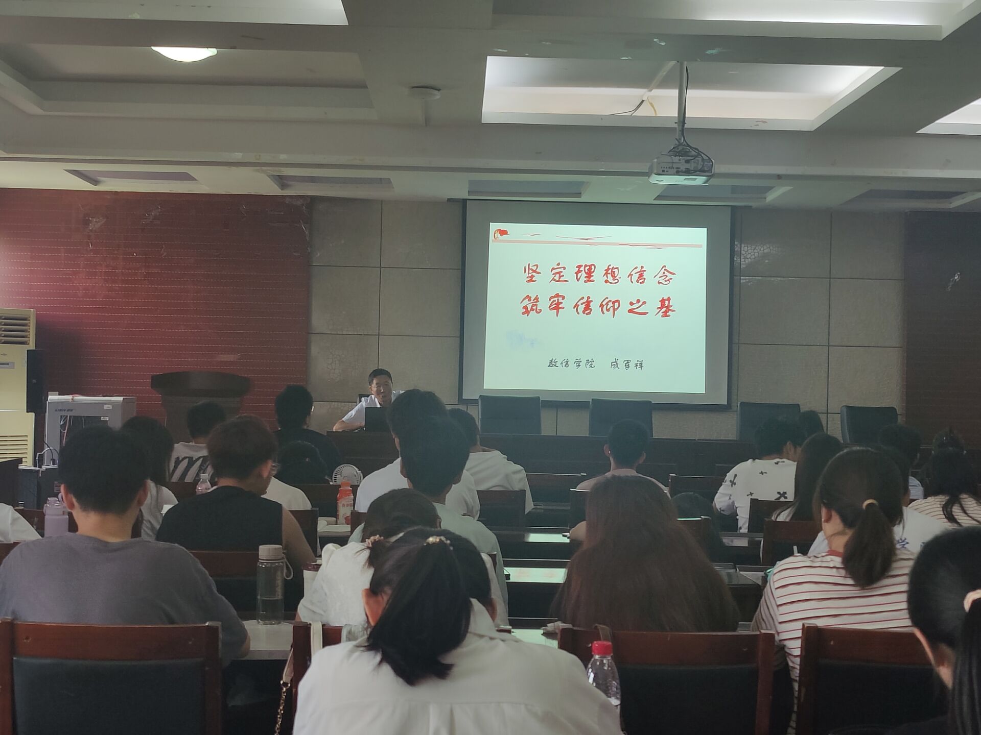 本网讯(通讯员 赵楠/图文)为进一步加强入党积极分子的思想政治建设,提高他们对党的认识和信仰,做好学院入党积极分子教育培养工作, 5月26日上午,学院关工委常务副主任成军祥在学院3401会议室为80余名入党积极分子讲授《坚定理想信念 筑牢信仰之基》专题党课。