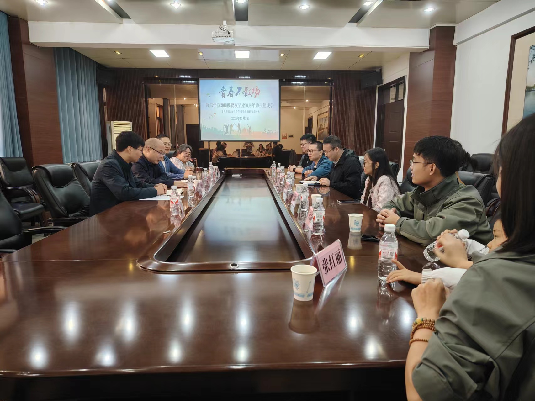 本网讯(通讯员 王璐璐)10月3日,数信学院2010级校友重返母校,该院在院楼211会议室举行师生座谈会。院领导班子成员、教师代表参加交流活动,座谈会由院党委副书记王明中主持。