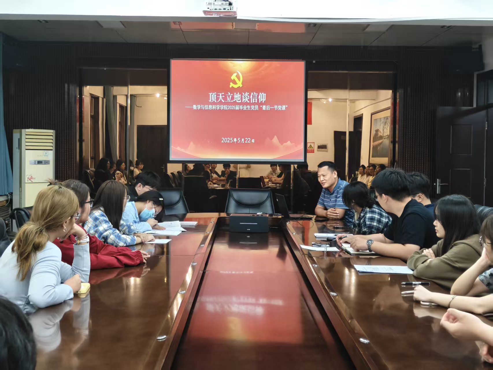 本网讯(通讯员 赵楠)为进一步加强毕业生党员的党性修养,增强党员意识和责任感,5月22日下午,学院党委书记刘春德以“顶天立地谈信仰”为主题,在学院二楼会议室为全体毕业生党员上“最后一节党课”。毕业班辅导员及2025届毕业生党员参加了此次活动。