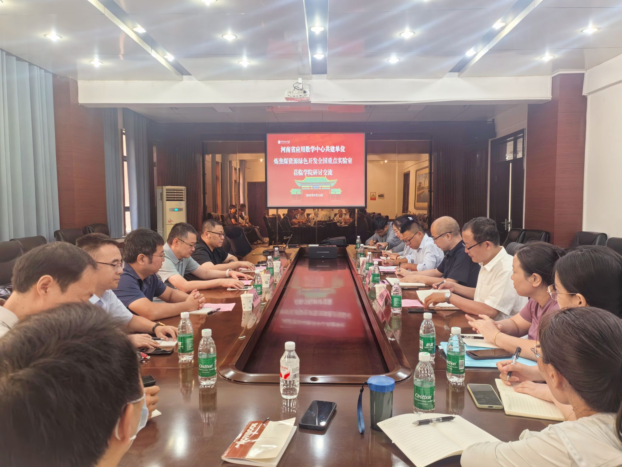 9 月 13 日上午,应河南省应用数学中心(河南理工大学)邀请,中心共建单位中国平煤神马控股集团有限公司炼焦煤资源绿色开发全国重点实验室执行主任王满、综合部主管张烁、综合部三级工程师刘帅涛莅临数学与信息科学学院,双方在学院二楼会议室围绕河南省应用数学中心建设展开深入交流。数学与信息科学学院院长毋海根、河南省应用数学中心主任司增艳、数学与交叉科学研究中心执行主任班涛、中心骨干教师代表等出席会议。会议由副院长司增艳主持。