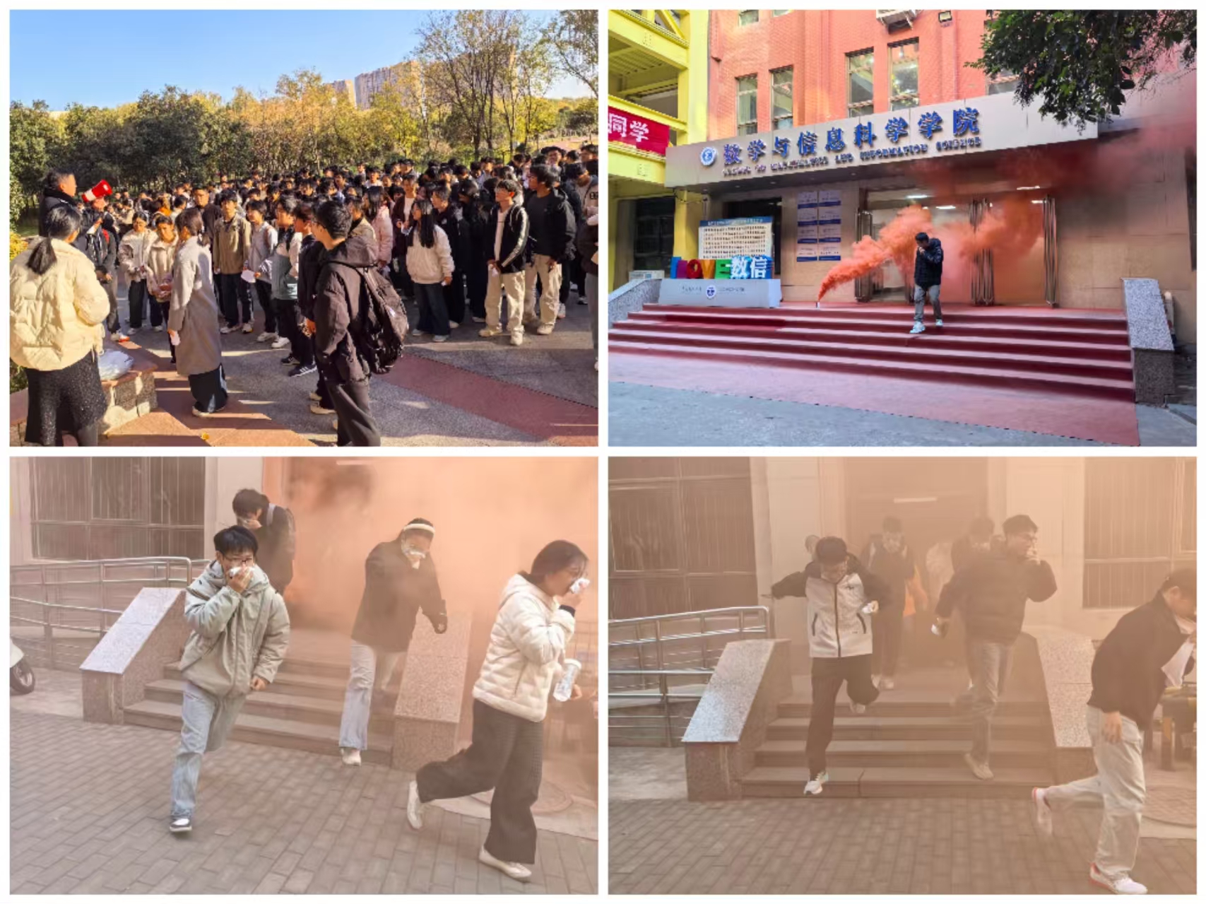 理论讲解结束后,实战演练环节随即展开。模拟火灾现场烟雾弥漫,警报声响起,师生们在工作人员的引导下,迅速按照预定逃生路线,用湿毛巾捂住口鼻,弯腰低姿,有序撤离至学院楼后广场的安全区域。整个疏散过程紧张有序,师生们反应迅速、配合默契,仅用3分钟便完成了全部疏散任务。