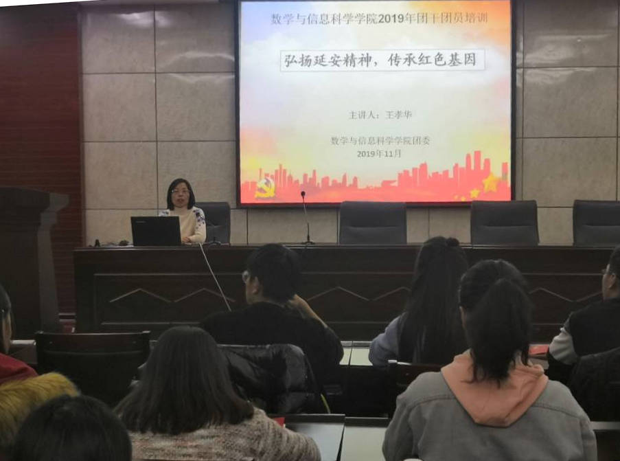 为传承红色基因,进一步提高学院团员青年和团干队伍的整体素质,不断加强基层团组织建设,。数信学院团委11月28日于3401开展了以“弘扬延安精神,传承红色基因”为主题的团员团干培训大会。数信学院各班班长,团支书及团员代表参加了此次会议。本次培训由团委老师王孝华担任主讲人。