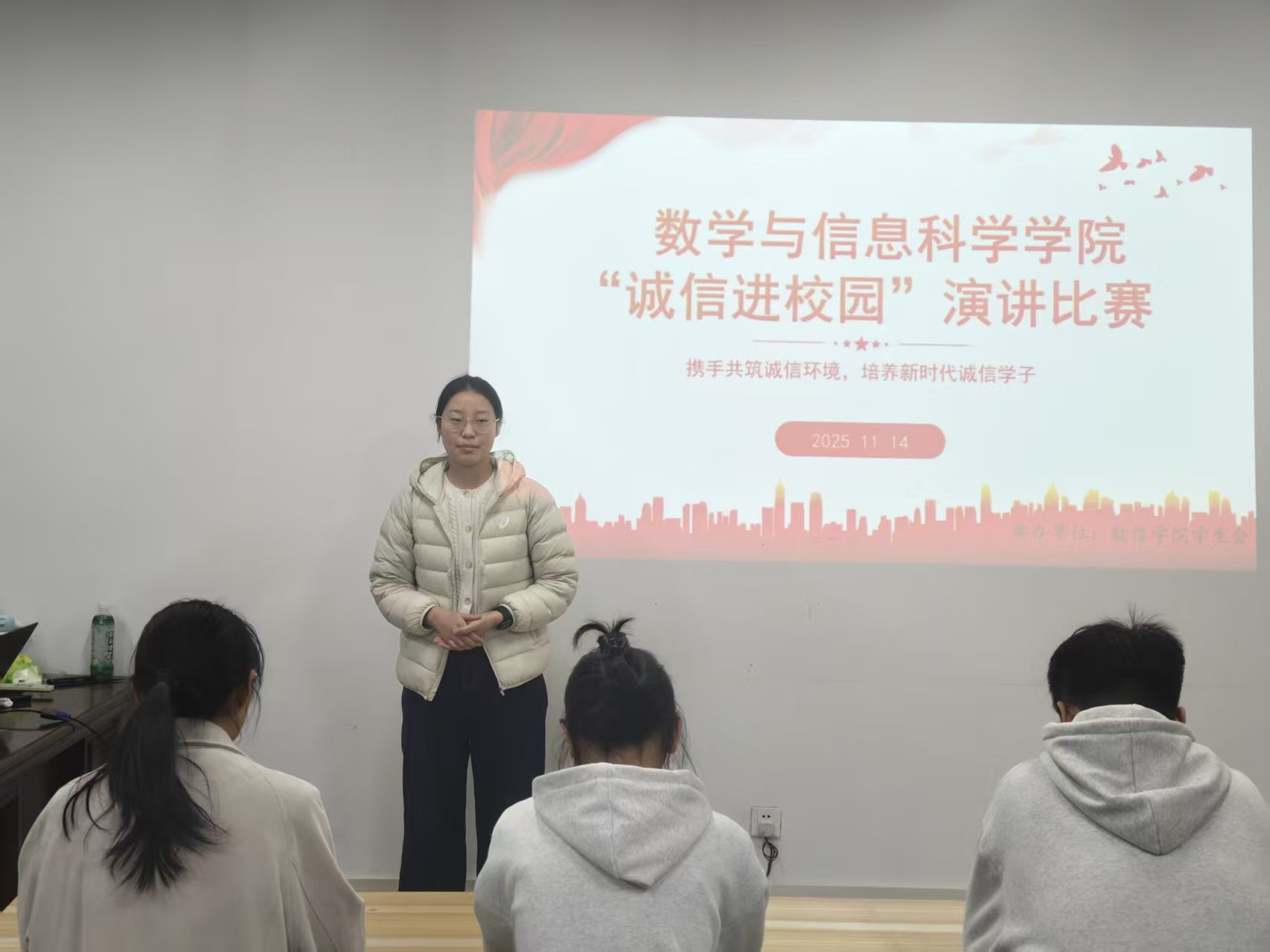 本网讯(通讯员 詹子墨 买俊杰)为深入培育和践行社会主义核心价值观,强化师生诚信素养与责任担当,营造风清气正的学院氛围,11月14日下午五点三十分,我校数信学院于学院106教室举办了“诚信校园行”演讲比赛。