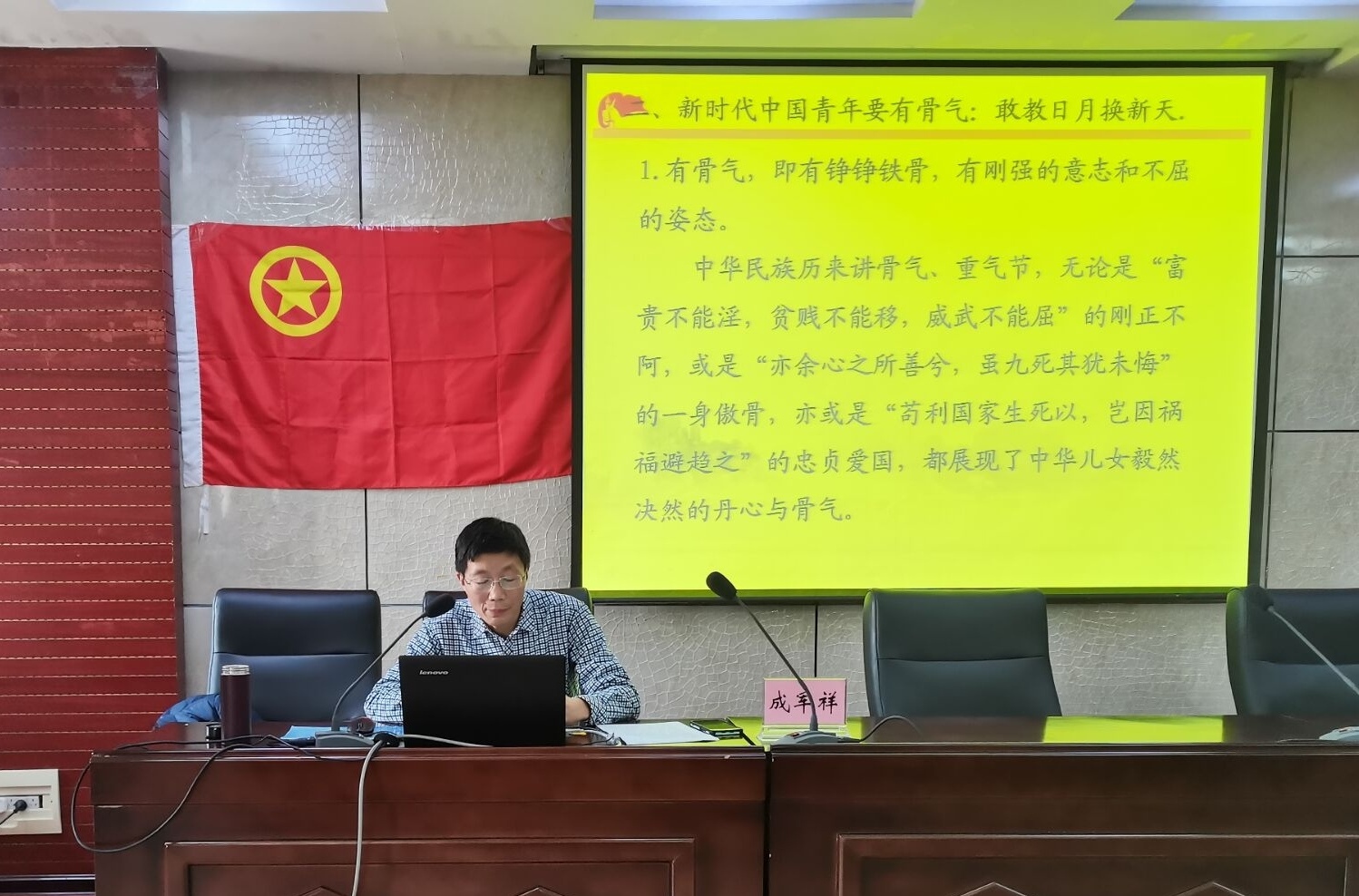 开班仪式结束后,成军祥以《立鸿鹄志,练真本领》为主题,从新时代中国青年要有志气、有骨气和有底气三方面进行阐述,指出当代大学生应当坚定理想信念,磨练坚强意志,练就过硬本领,把小我融入大我,在奋斗中实现青春梦想。