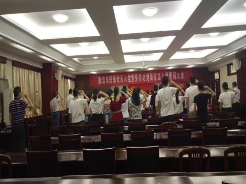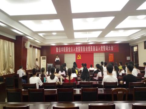 为庆祝中国共产党成立97周年,2018年7月1日上午,数信学院在3401会议室召开新党员入党宣誓暨老党员重温入党誓词大会。学院党委书记成军祥、党委副书记沈立、副院长邓继恩、团委书记黄峰、公共数学教学部主任王振辉、专职辅导员田海燕和全体学生党员共计40余人参加了大会,大会由黄峰同志主持。