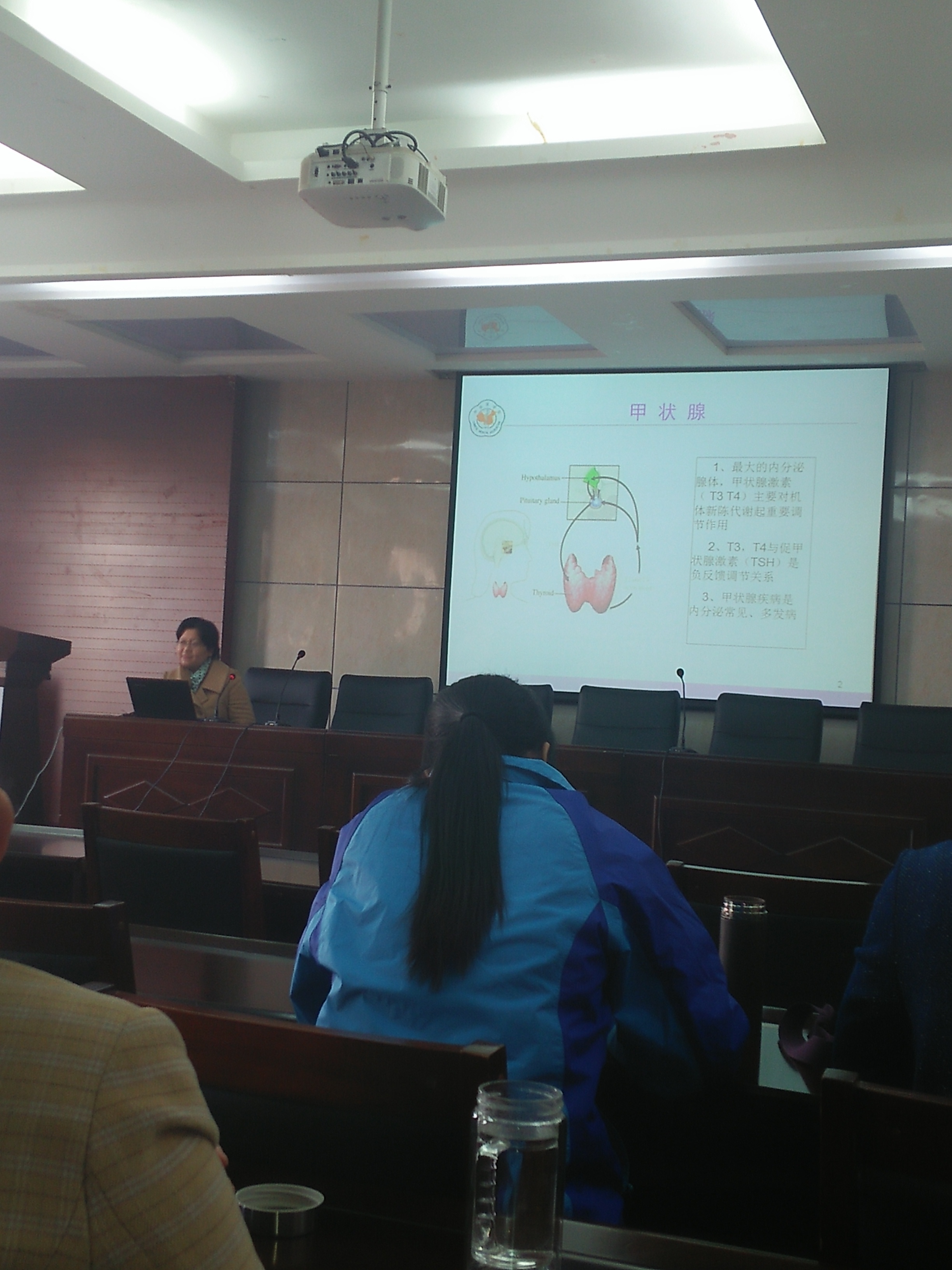 讲座上,李娟就常见甲状腺疾病、一般治疗方法及妊娠与甲状腺疾病三个方面作了详细讲解。讲座伊始,她对甲状腺及其功能作了简单介绍,并指出,甲状腺对机体内分泌、新陈代谢起重要调节作用。随后,她以结节性甲状腺肿、甲状腺功能减退症、亚急性甲状腺炎等常见甲状腺疾病为例,详细阐述了这些病症的引起因素、症状和一般治疗方法及随访措施。而后,她对甲状腺超声检查的相关问题作了讲解和说明,她强调,“早发现,早治疗”是控制和治疗甲状腺疾病的有效措施。最后,她对妊娠期关于甲状腺疾病应当注意的相关问题作了全面说明。