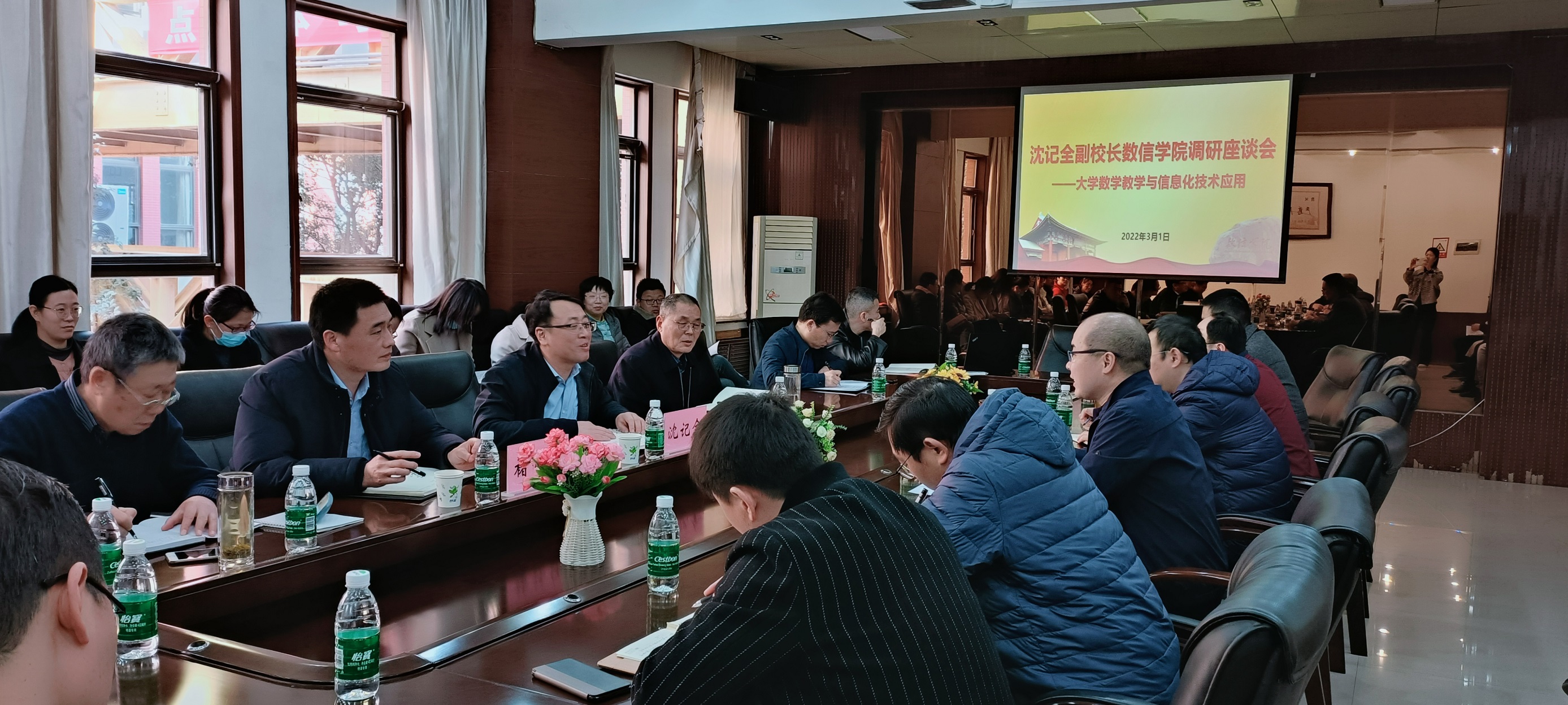 3月1日下午,沈记全副校长到数信学院调研指导工作,在数信学院会议室召开了题为“大学数学教学与信息化技术应用”座谈会,教务处副处长褚怀保陪同。数信学院党委书记成军祥、院长原保全等领导班子成员和教师代表共计三十余人参加了座谈,会议由原保全院长主持。