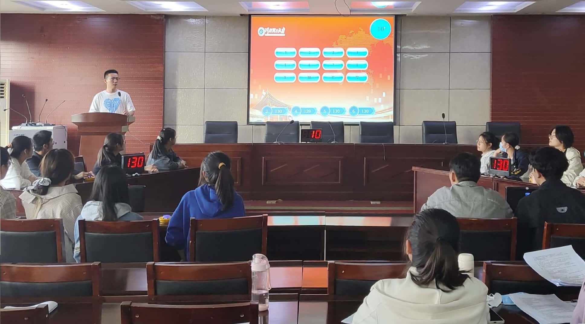 比赛开始,主持人介绍本次团史知识竞赛的比赛流程与规则。比赛共分为必答题与抢答题两个环节,每支队伍的最终得分为两个环节得分之和。参赛共八支队伍,每支队伍四名队员,分为A、B两组依次进行比赛。比赛过程中,各参赛队伍准备充分、应变灵活,充分展现了我院学生丰富的团史知识和较强的团队合作精神。经过两个环节的比拼,四支队伍通过初赛,晋级决赛。经过决赛的激烈角逐,最终贺仕如、黄振龙、张子岩和谭碧玉四名同学被评为“优秀选手”,他们将代表学院参加校赛的角逐。其余表现较为优异的同学依次颁发一、二、三等奖。