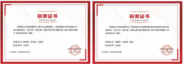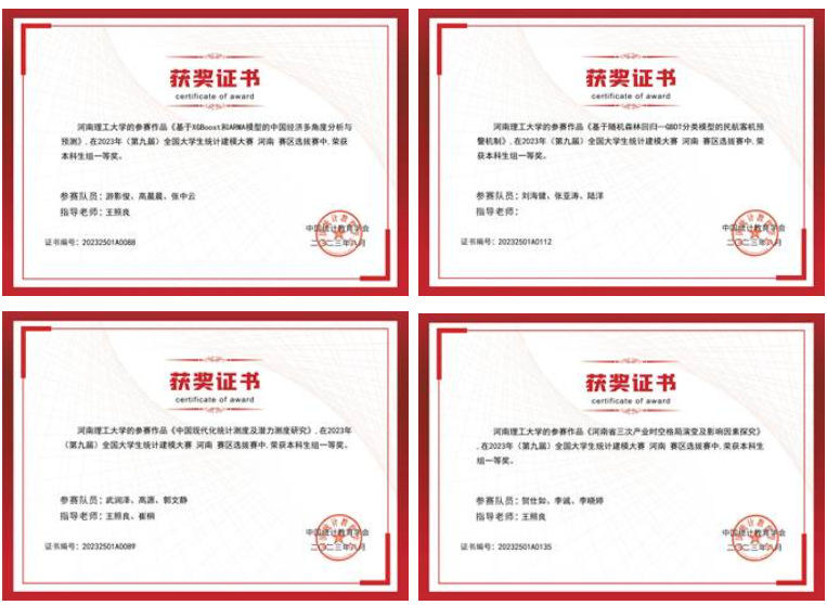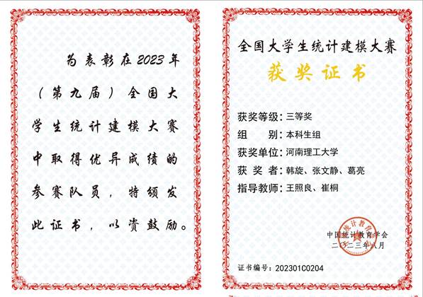 本网讯(通讯员 王照良)近日,第九届(2023)全国大学生统计建模大赛获奖名单公布。我校组织选拔27支本科生队伍,11支研究生队伍提交了论文参赛,最终获得国家三等奖1项,省级一等奖7项,省级二等奖10项,省级三等奖12项的优异成绩。获奖数量层次较往年有很大提升,获奖比例远高于省内高校的平均水平,为学校争得了荣誉。