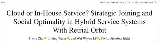 近日,IEEE旗下权威期刊《IEEE Systems Journal》发表了数信学院朱盛副教授、中央财经大学王金亭教授以及美国德克萨斯南方大学Wei Wayne Li教授合作的新成果《Cloud or In-House Service? Strategic Joining and Social Optimality in Hybrid Service Systems with Retrial Orbit》。