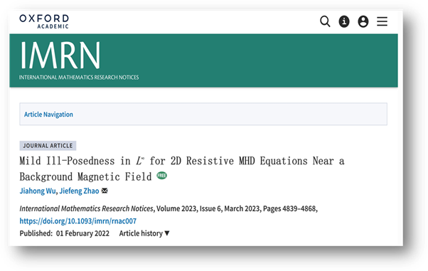 近日,我院数学与应用数学系赵杰风博士以通讯作者在国际高水平数学期刊《International Mathematics Research Notices》发表论文《Mild ill-posedness in L∞ for 2D resistive MHD equations near a background magnetic field》。