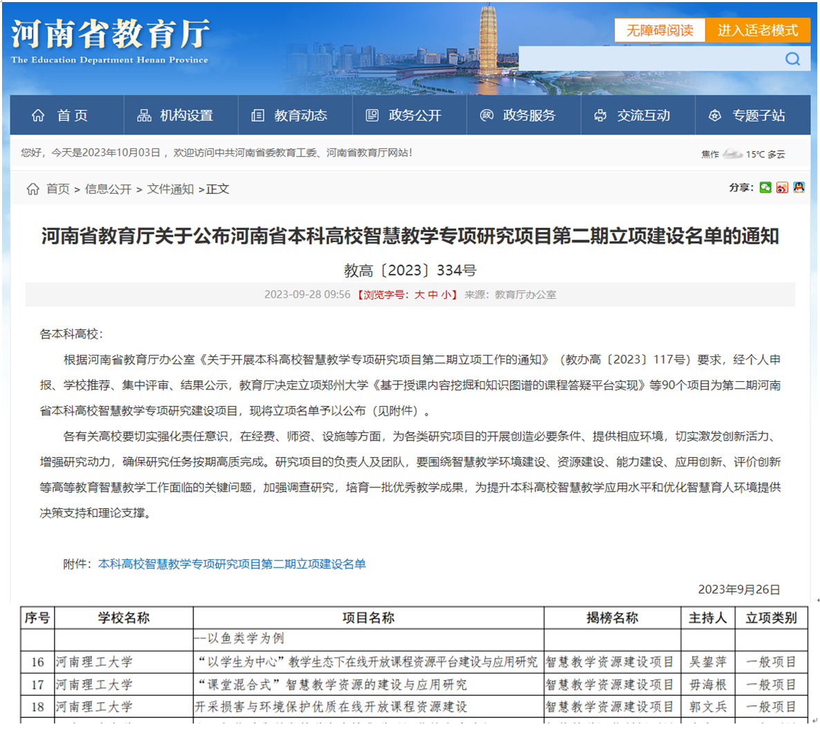 本网讯(通讯员 王明中)日前,河南省教育厅公布了2023年度河南省本科高等学校智慧教学专项研究项目第二期立项建设名单,由我院毋海根副教授牵头申报的《“课堂混合式”智慧教学资源的建设与应用研究》获批立项建设,全校共有三个项目获批。