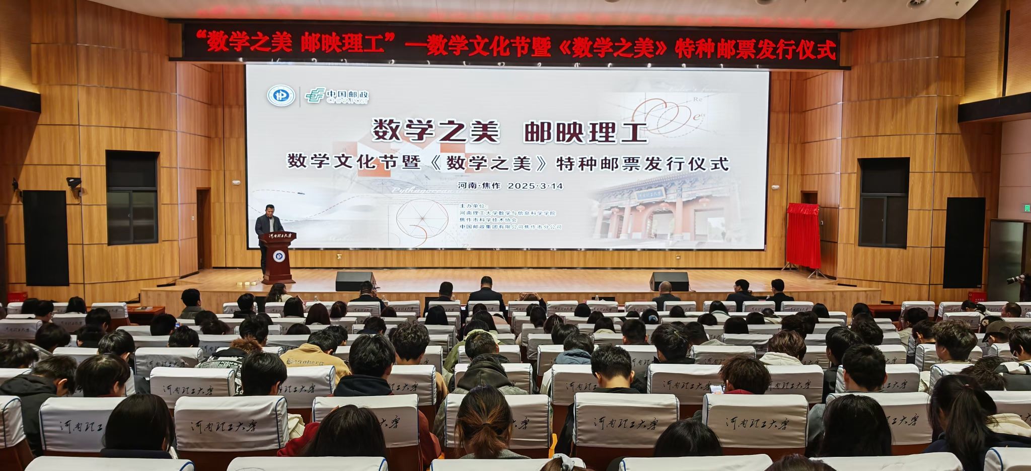 3月14日下午15时,“数学之美、邮映理工”——数学文化节暨《数学之美》特种邮票发行仪式在河南理工大学第二图书馆A报告厅举行。活动由我校数学与信息科学学院、焦作市科学技术协会、焦作市邮政分公司主办,焦作市第十一中学、焦作市集邮协会等单位协办,来自相关单位的师生人员共300余人参加活动。