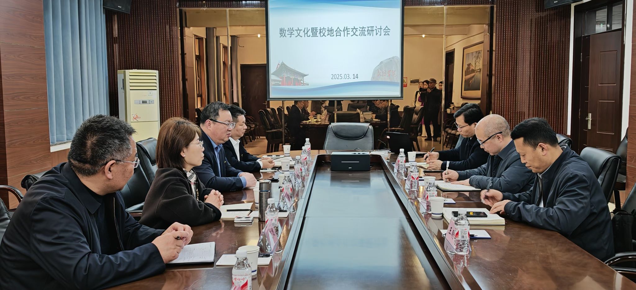 仪式后,在数学与信息科学学院二楼会议室召开了数学文化暨校地合作交流研讨会,与会领导嘉宾围绕弘扬数学文化、推进数学科普、推动成立焦作市数学会、加强展校地合作等方面,展开了交流研讨。