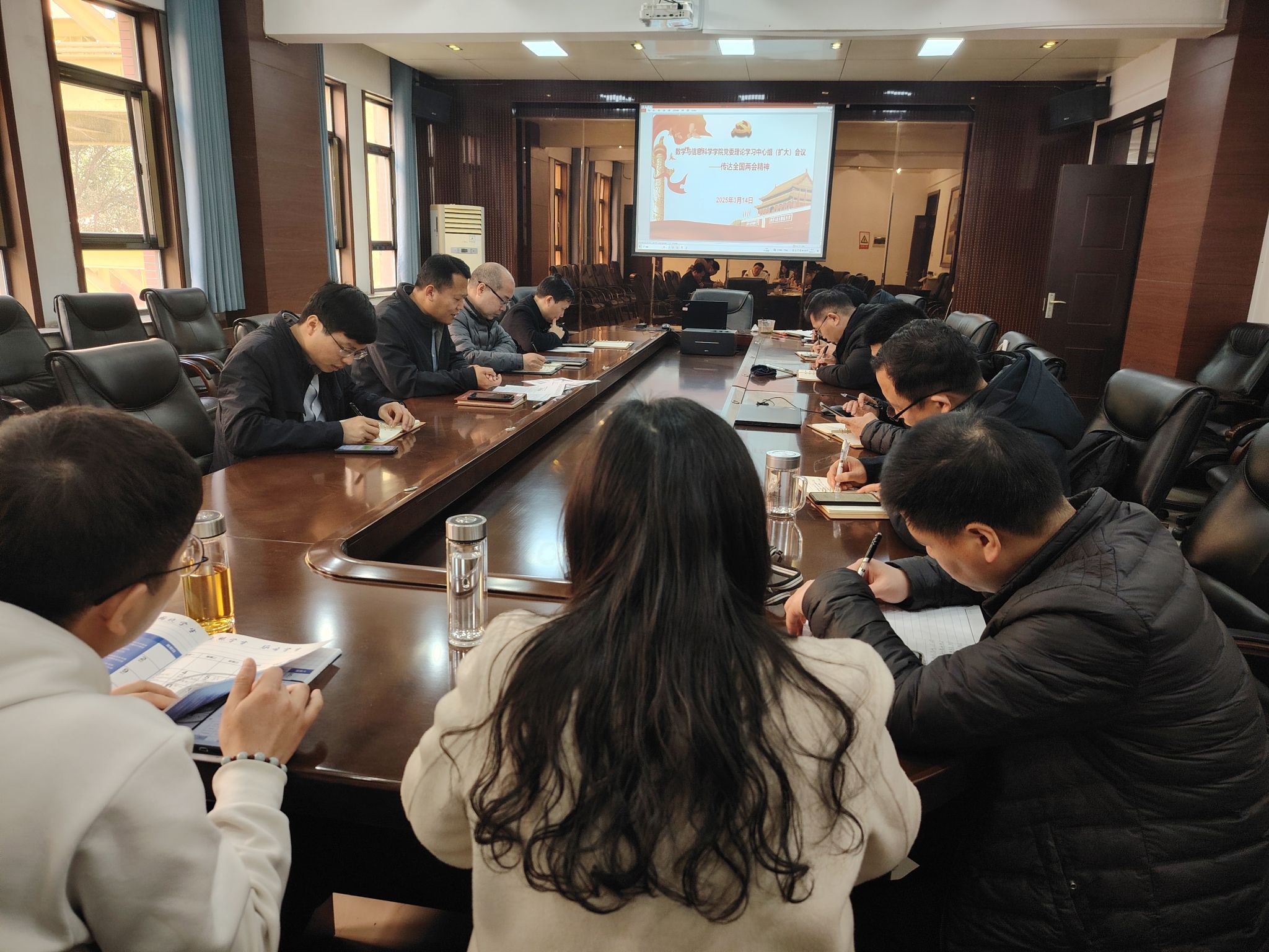 本网讯(通讯员 王璐璐)3月14日上午,数信学院党委理论学习中心组召开专题(扩大)学习会,集中传达学习全国两会精神。院党委书记刘春德主持会议并领学,院党委委员、非党员处级领导、科级干部参加会议,并围绕学习主题开展交流。