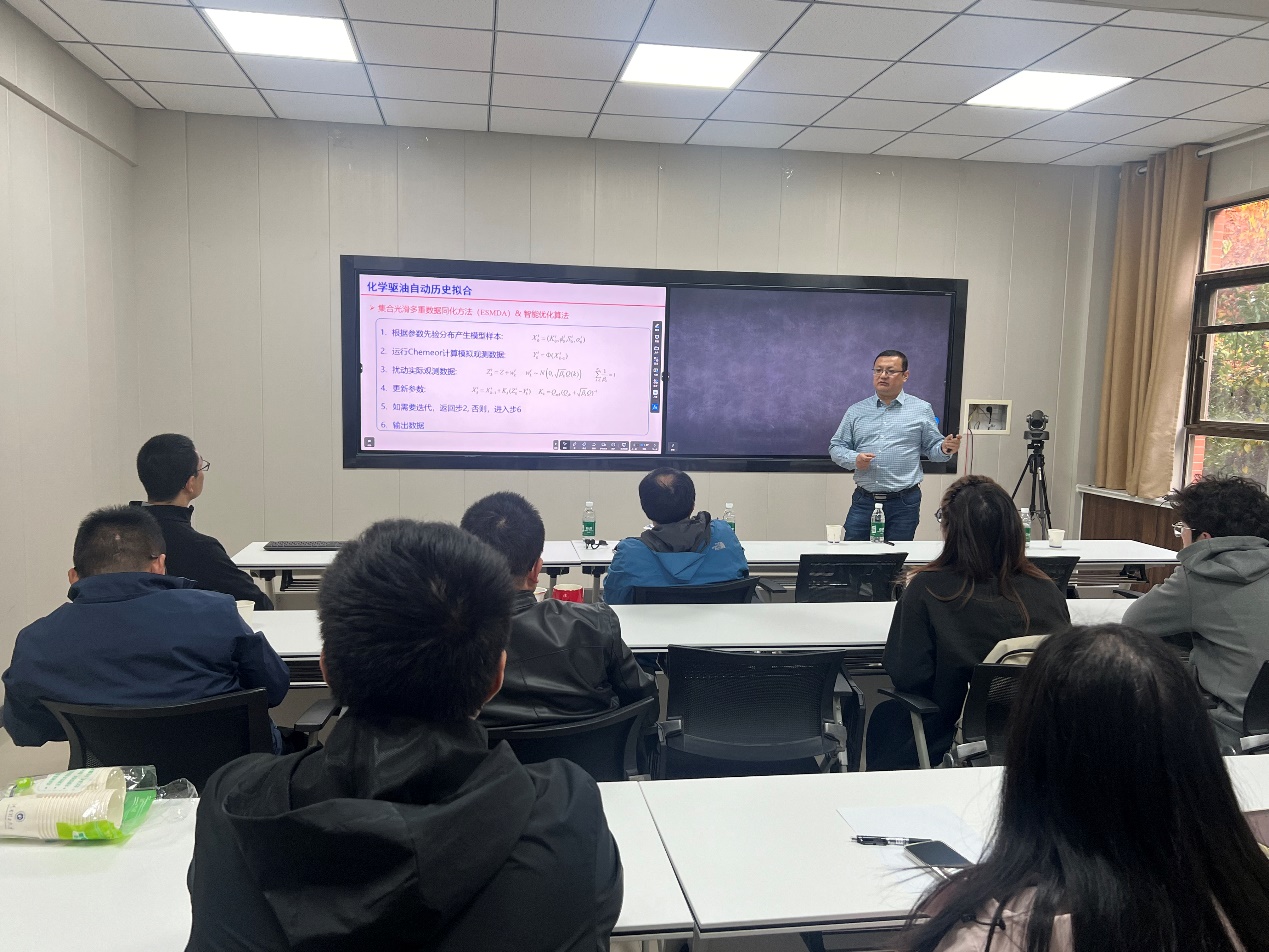 报告中,席开华深入浅出地介绍了化学驱油技术在提高油田采收率中的应用背景与重要意义。他首先系统阐述了化学驱油模拟的数学模型,该模型由化学组分运移方程和描述提高采收率机理的代数方程构成。随后,他重点讲解了求解该模型的数值算法及其在专业模拟软件中的实现过程,并展示了与该软件接口的自动历史拟合模块在中国某油田的实际应用案例。整场报告逻辑清晰,从理论模型到算法实现,再到工业应用,完整呈现了计算数学研究成果走向工程实践的转化路径。在互动环节,席开华与在场师生就数值模拟的精度与效率平衡、算法创新面临的挑战以及数学在工业软件研发中的核心作用等问题进行了深入探讨与交流,现场气氛热烈。