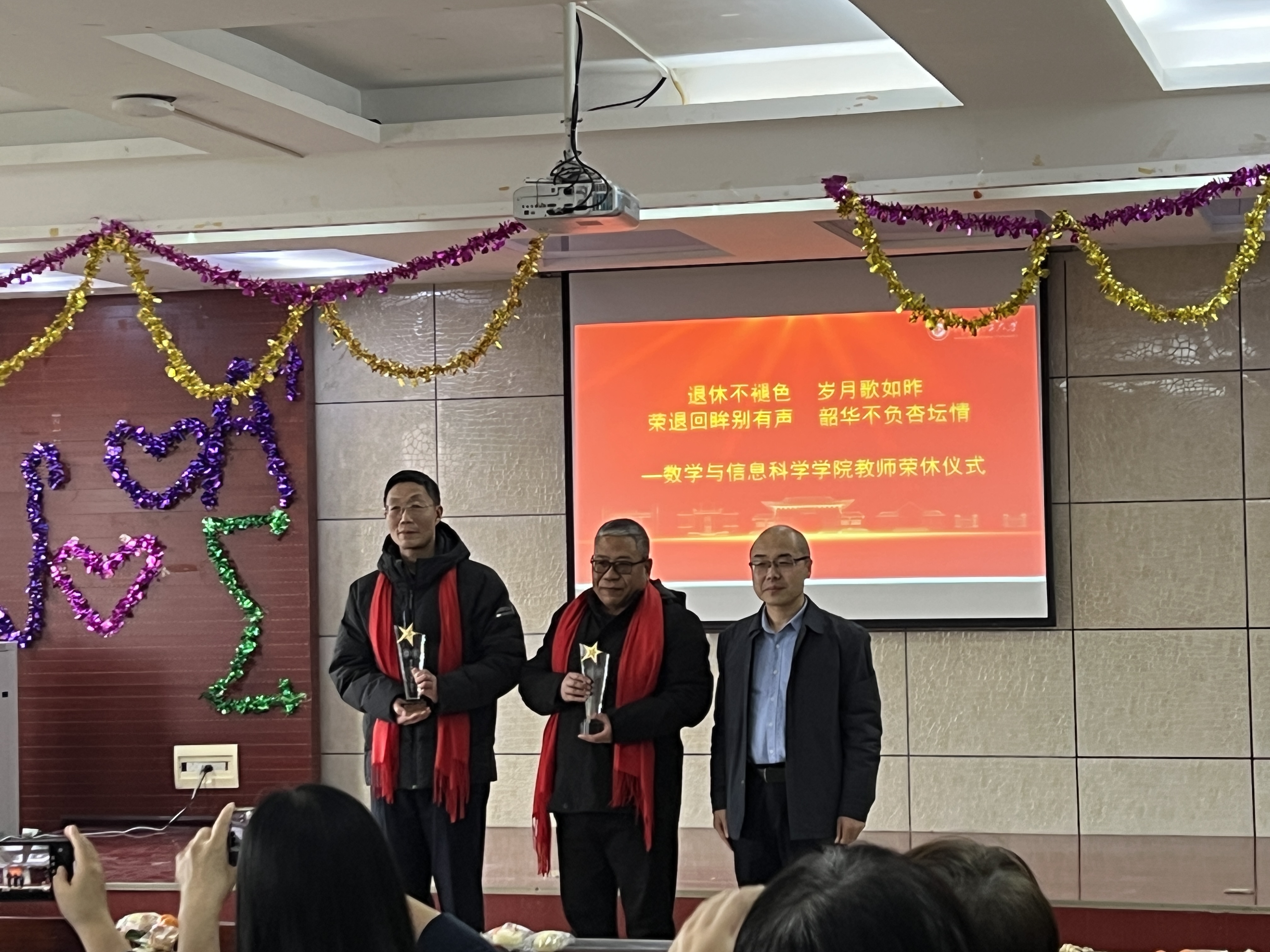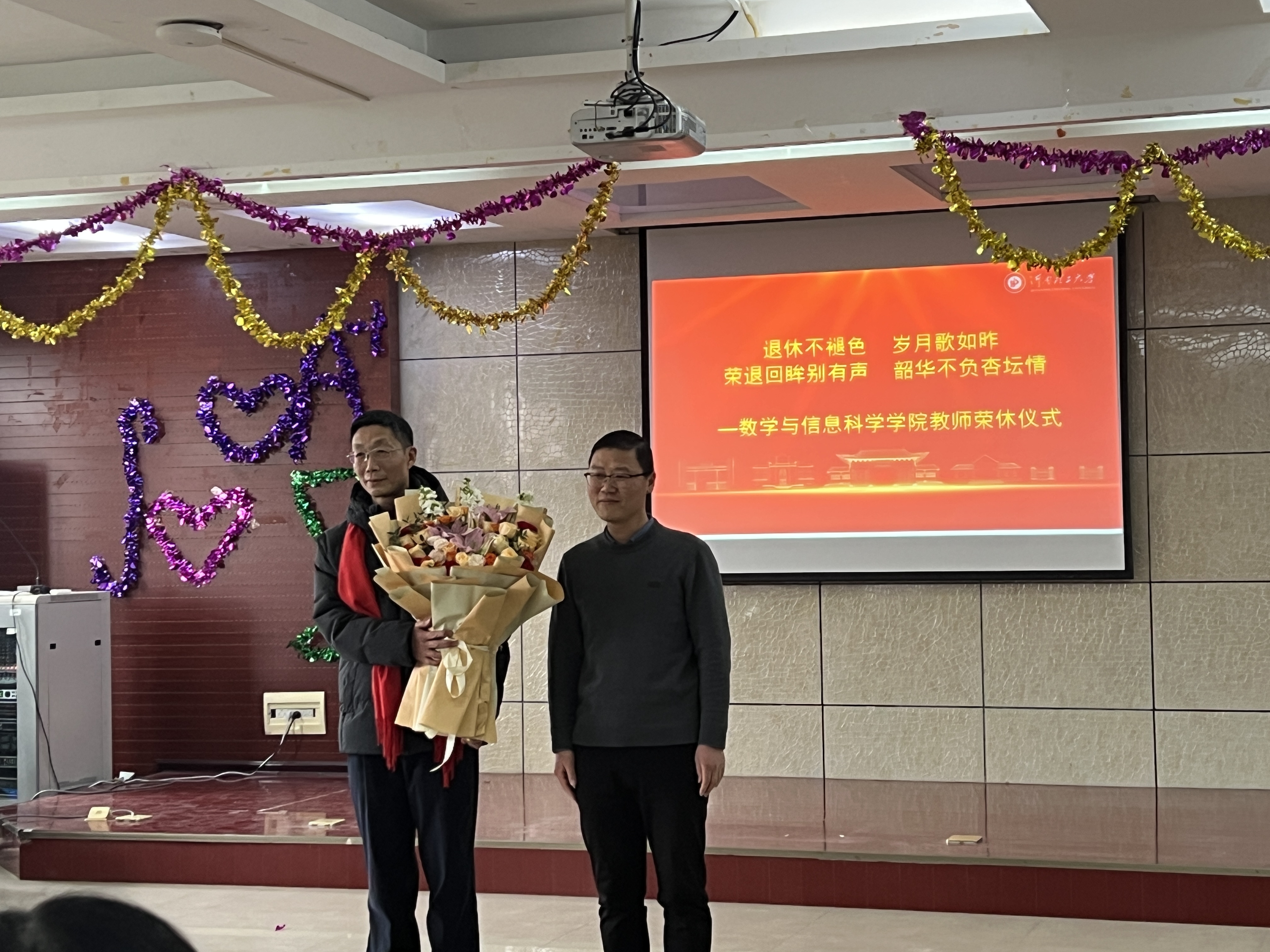 本网讯(通讯员 关静)岁末温情暖,薪火永相传。12月31日下午2:30,数信学院在3401会议室举行郭白妮、祁锋、景书杰、成军祥、原保全等五位教师荣休仪式。学院全体院领导、全体教职工及学生代表齐聚一堂,共同致敬教育耕耘者,共话初心与传承。因个人事务,郭白妮、祁锋、原保全三位老师未能亲临现场,学院特通过现场致敬的方式传递对他们的感恩与祝福。
