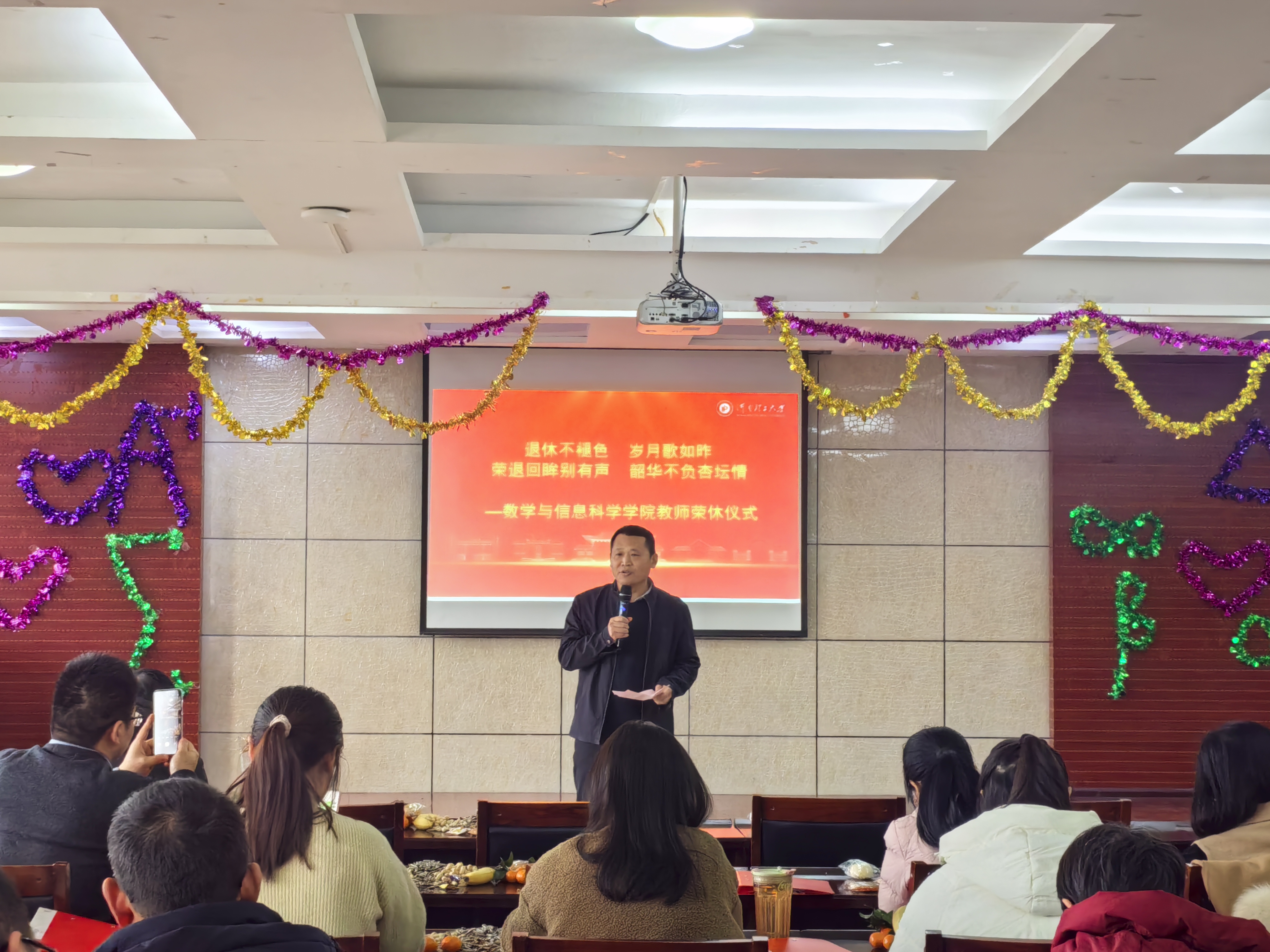 最后,学院党委书记刘春德作总结讲话。他用“一支粉笔两袖风华,三尺讲台四季晴雨”高度概括了退休教师的育人情怀与奉献精神。他指出,五位老师既是同事,也是长辈与榜样,他们身上彰显的数信人精神,是学院最宝贵的财富。他希望退休教师们能好好享受退休生活,常回“家”看看,同时鼓励全院教职工以退休教师为榜样,传承爱岗敬业、深耕育人的优良作风,为学院高质量发展贡献力量。