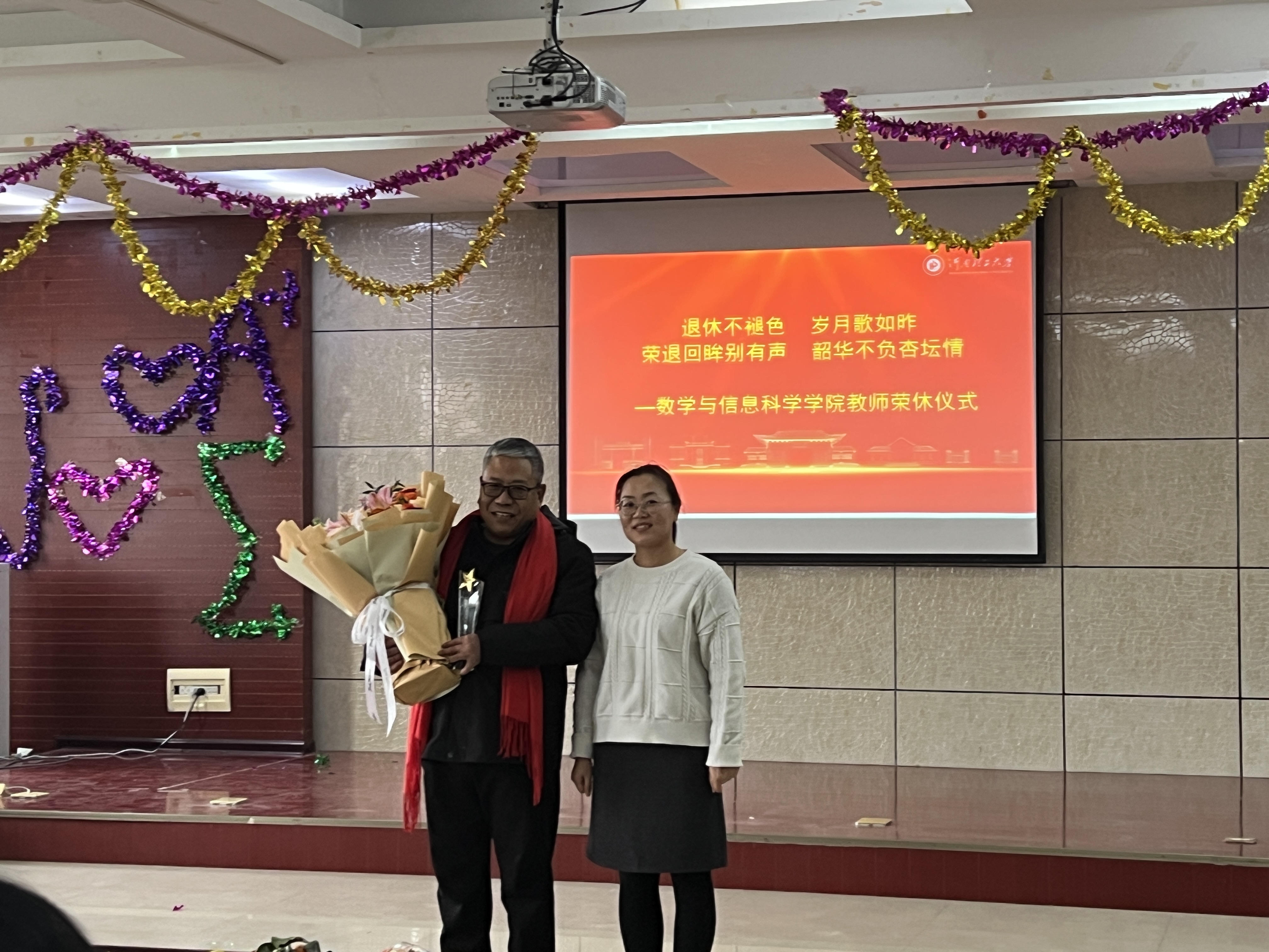鲜花赠恩师,温情暖人心。随后周玲玲老师、刘中强老师分别代表全院教师,向到场的景书杰、成军祥两位老师献上鲜花,以青春之礼致敬前辈深耕教育的坚守,也传递出数信学院育人精神代代相传的温情。