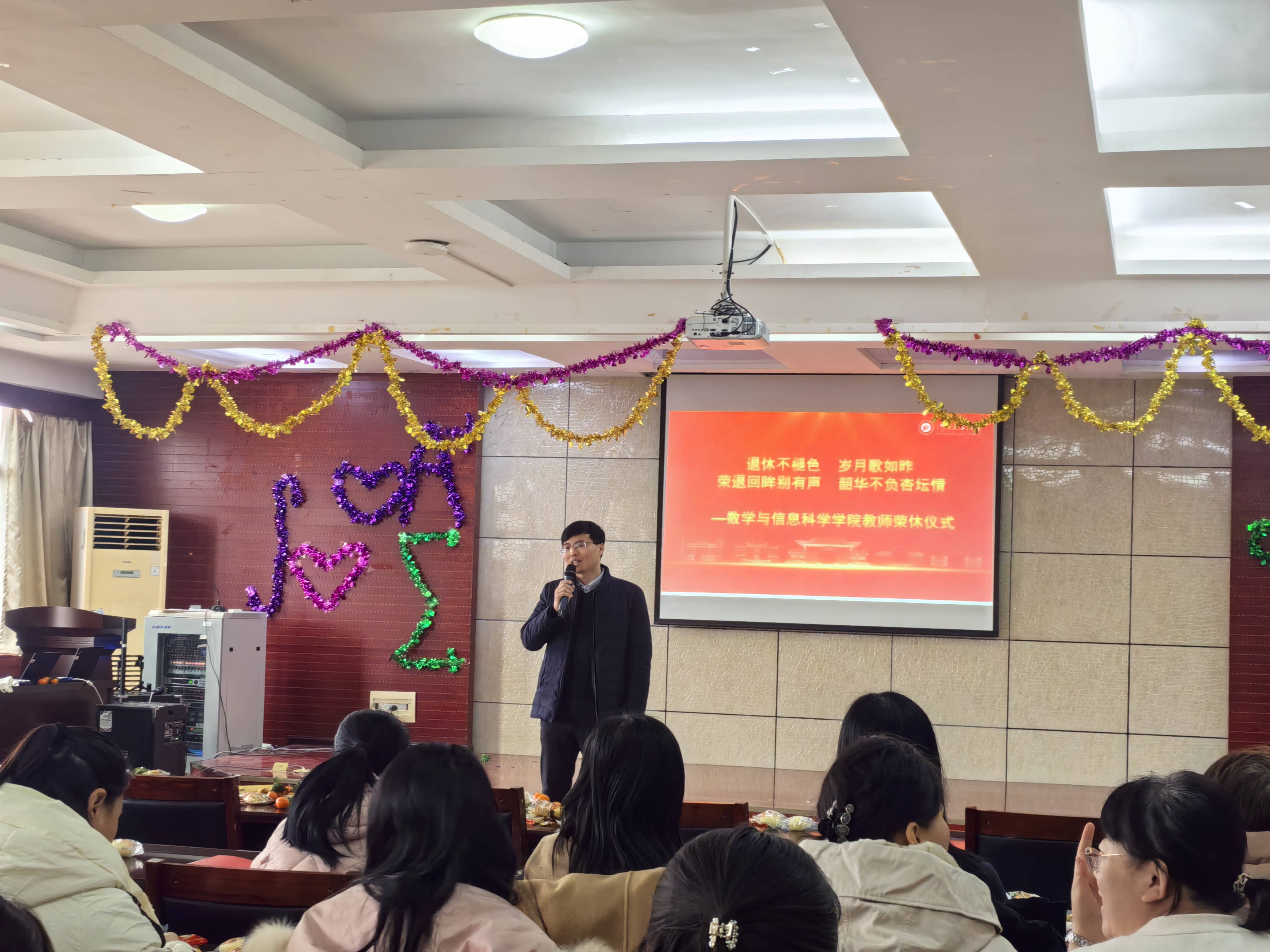 仪式伊始,院党委副书记兼工会主席王明中主持会议并致开场词。他深情表示,五位老师将数十年光阴奉献给教育事业,扎根数信学院,为学院发展与人才培养倾注心血、贡献力量,向五位老师致以热烈的祝贺和崇高的敬意,也对他们的辛勤付出表达衷心感谢。