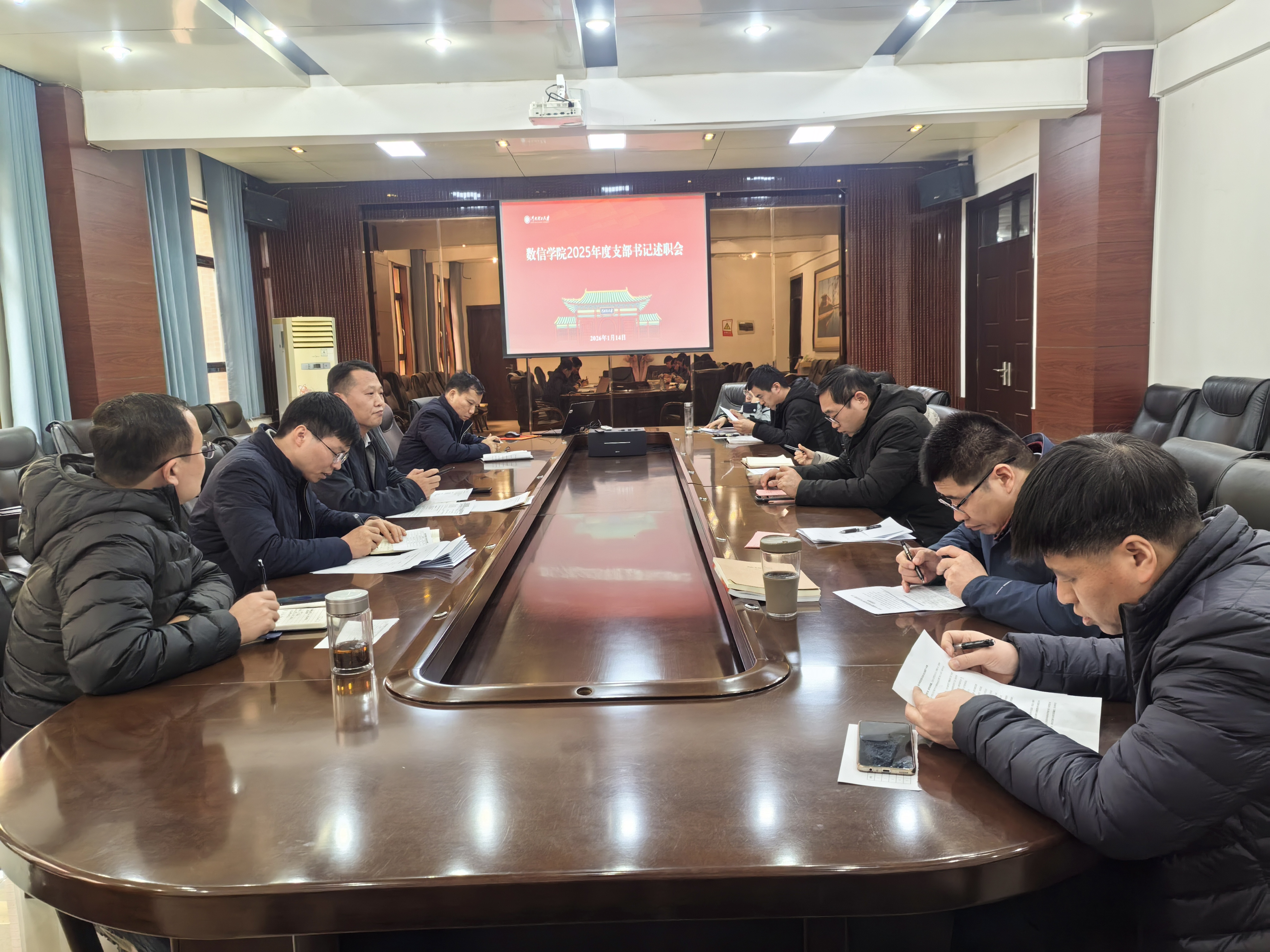 本网讯(通讯员 关静)1月14日上午,数信学院党委在二楼会议室召开2025年度党支部书记抓党建工作述职评议会。院党委委员、各党支部书记参会。院党委书记刘春德主持会议,并对各支部书记述职情况逐一点评,对下一步工作提出要求。