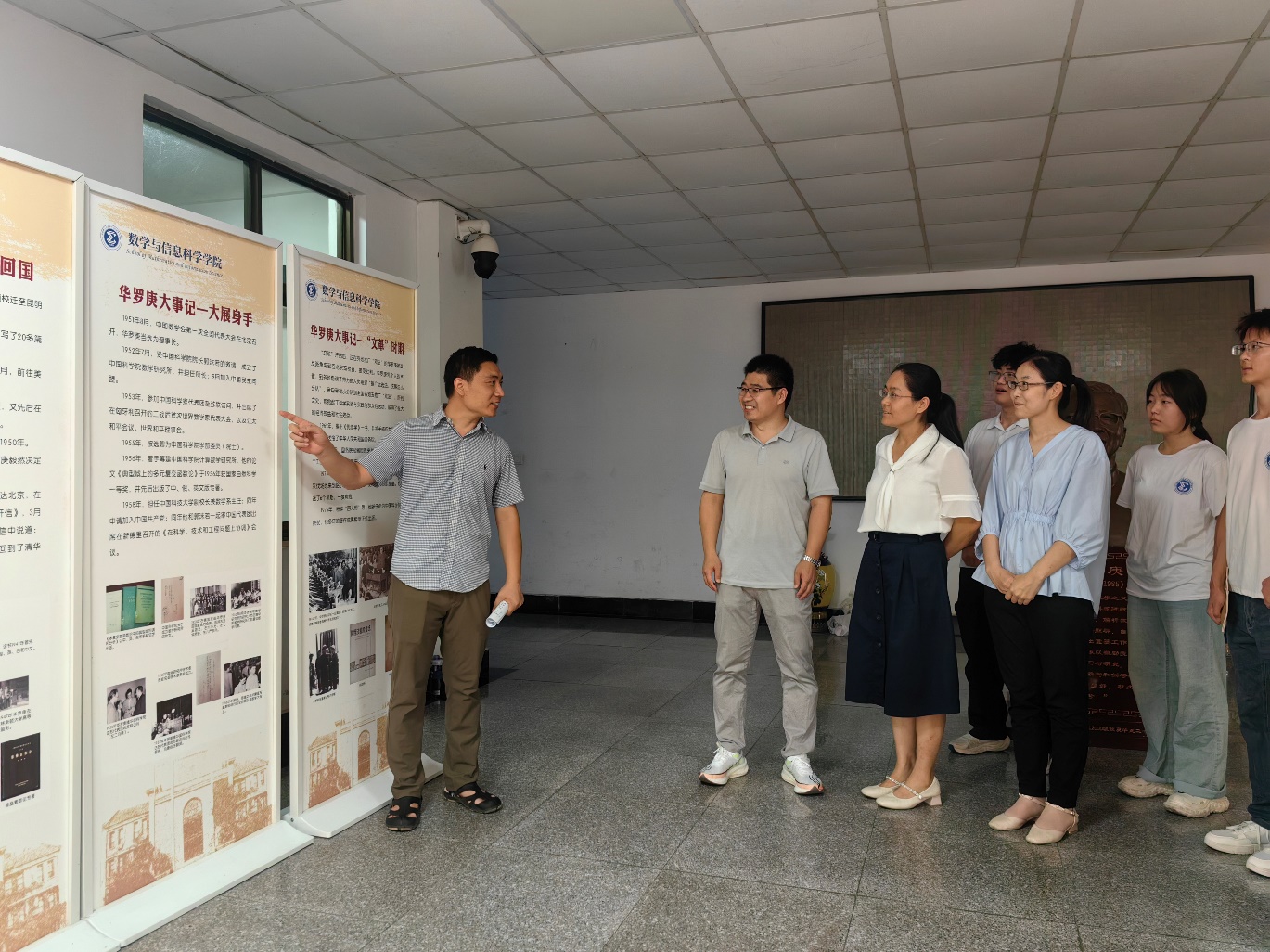 在赵小奎的带领讲解下,大家共同瞻仰了人民数学家华罗庚先生铜像,参观了华罗庚科学事业成就展,学习了华罗庚先生矢志不渝、“70岁入党终不悔”的崇高追求和爱国报国的光辉事迹。通过参观图片展、学习交流,全体人员对华罗庚先生的生平事迹、科学成就、高尚情操有了更深入的了解,同时也激发了在数学领域追求卓越、勇于创新的热情和动力。听完讲解之后,团队成员们深受触动,纷纷围在四位老师身边,迫不及待地分享自己的感悟与思考。在热烈的交流中,华罗庚先生的崇高精神仿佛穿越时空,在大家心中点燃了追求真理、报效祖国的火种。