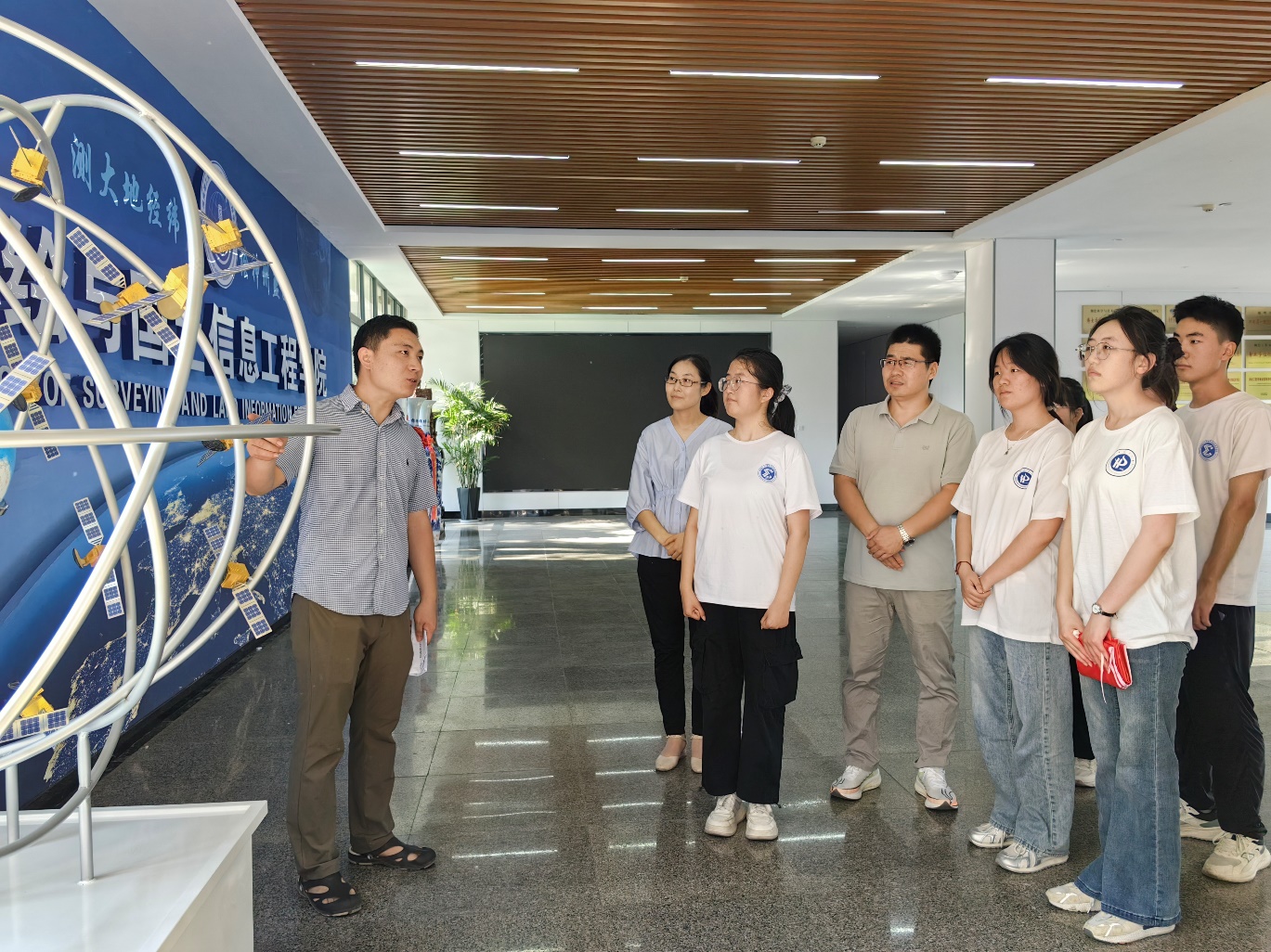 在校内的北斗卫星导航系统模型前,赵小奎老师以钱学森等先驱用算盘与手摇计算器完成轨道测算的故事为引,缓缓展开了中国航天与北斗系统的壮阔画卷。他为大家讲述了“北斗人”突破技术封锁,通过“三步走”战略实现核心部件国产化的历程。李自来老师介绍了2023年发射的“河南理工一号”卫星,集成星上AI智能处理技术,具备物联通信、智能感知遥感功能,能获取高分辨率影像,为黄河流域生态保护等提供支撑,展现了从航天精神到高校科研的创新力量。听了两位老师的介绍,队员们对前辈们用简陋工具创造科技奇迹的智慧与毅力深感敬佩,也更加坚定了传承这份精神、用专业知识报效祖国的信念。