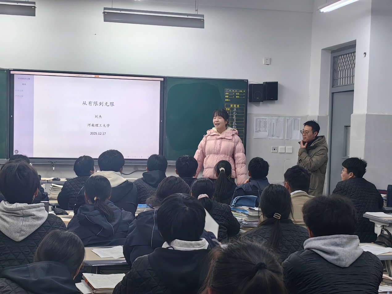 本网讯(通讯员 李自来)为搭建高校与高中数学教育的桥梁,12月17日下午,数学与信息科学学院数学与应用数学系党支部成员走进焦作市第一中学开展数学科普志愿服务。该支部党员刘杰副教授为高一学生带来了一场“从有限到无限”的数学科普讲座,并分享了数学家华罗庚的情系家国、一心向党、身残志坚、攀登高峰的励志故事。