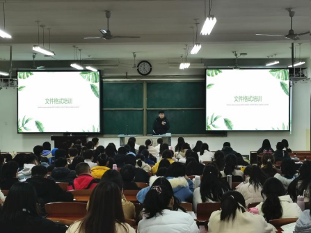 培训中,学习科创部部长刘文彬为同学们介绍常用文件编辑格式,主要包括策划书的注意事项、新闻稿的编辑格式、通知的拟定和如何写好总结四个方面。组织部副部万巍为同学们讲解常用办公软件使用技能,主要包括word和excel的基本操作,她表示掌握基本的办公技能将对我们的学习和生活带来极大的便利。宣传部部长王雨涵与同学们分享PPT制作的方法和技巧,他围绕PPT的界面与流程、装饰与模版、插入多媒体以及播放技巧四个方面展开讲解,结合实际操作,有利于大家充分理解PPT制作过程。